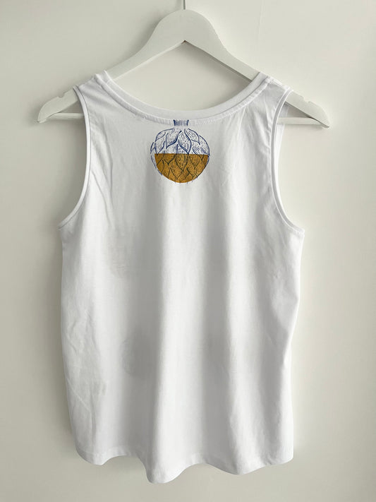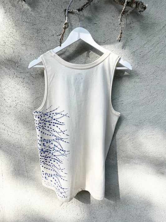 canotta color bianco o raw serigrafata con carciofi blu klein e mezze lune senape