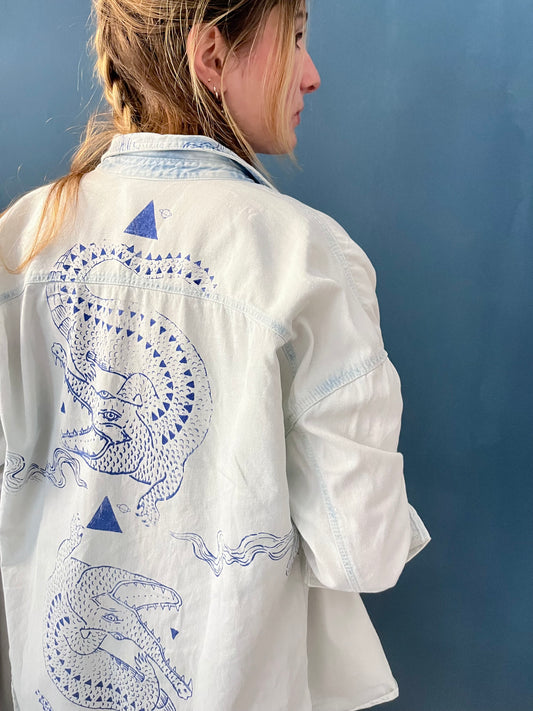 camicia upcycled 100% seta blu slavato con aculei di istrice e amata phegea