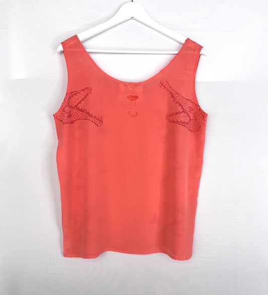 Canotta in seta color fragola con coccodrilli e mele serigrafati