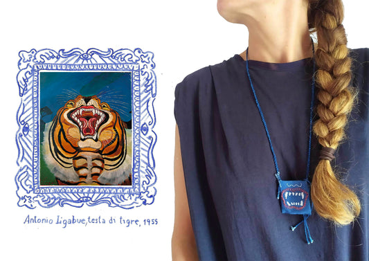 collana talismano contro l'aggressività ricamato a mano su stoffa immersa nell'indigo