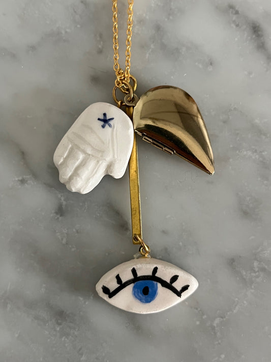 collana talisMANO con ciondolo lover's eye, mano in ceramica e metà cuore porta foto