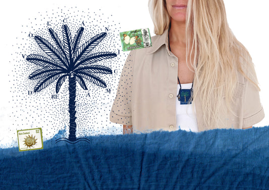 collana talismano -lasciatemi qui in un'isola remota- ricamato a mano su stoffa immersa nell'indigo
