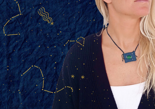 collana talismano del pianeta pisello ricamato a mano su stoffa immersa nell'indigo