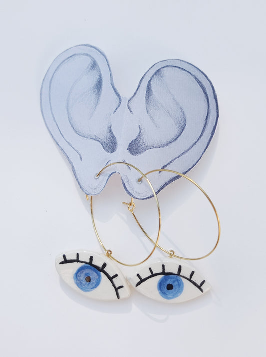 orecchini a cerchio dorati con occhio in ceramica iride azzurro