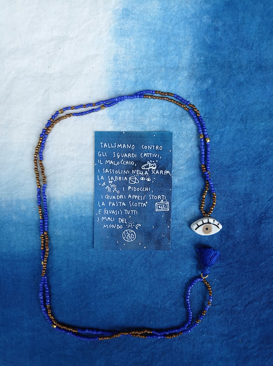 collana talismano della felicità con pendaglio in seta e cianotipia
