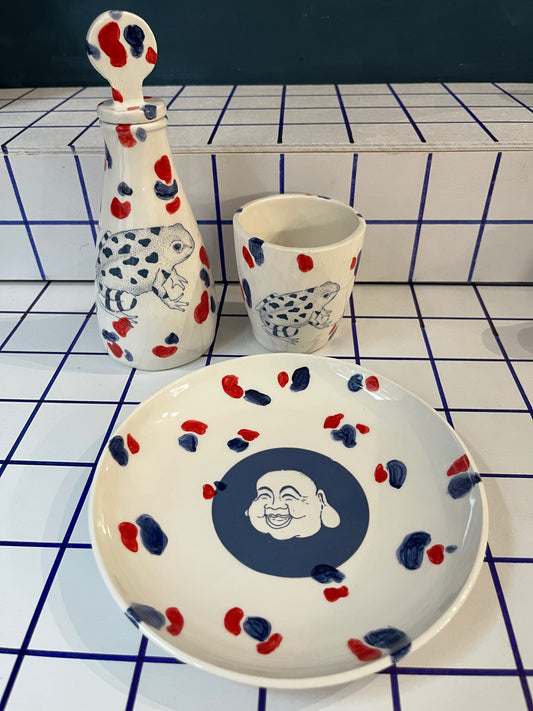 piatto bonzo felice in ceramica modellato e dipinto a mano