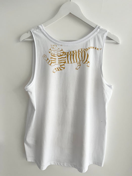 canotta color bianco o raw serigrafata con tigri senape o blu klein