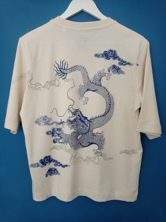 TSHIRT modello boxy color bianco raw serigrafata con dragoni