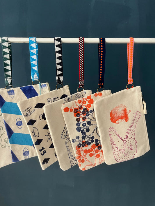sciarponi in lana deadstock blu serigrafati con disegni vulcanici