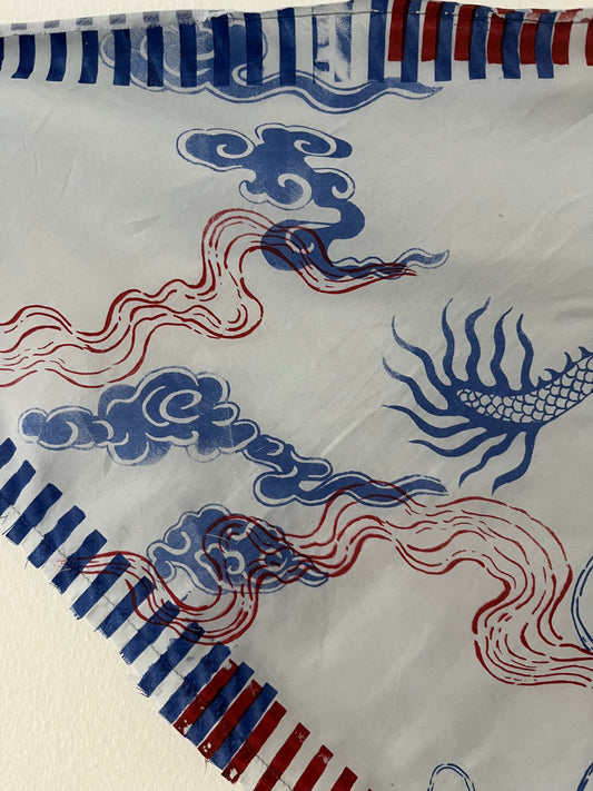 foulard bandana azzurro polvere con dragoni, nuvole e righe serigrafato a mano