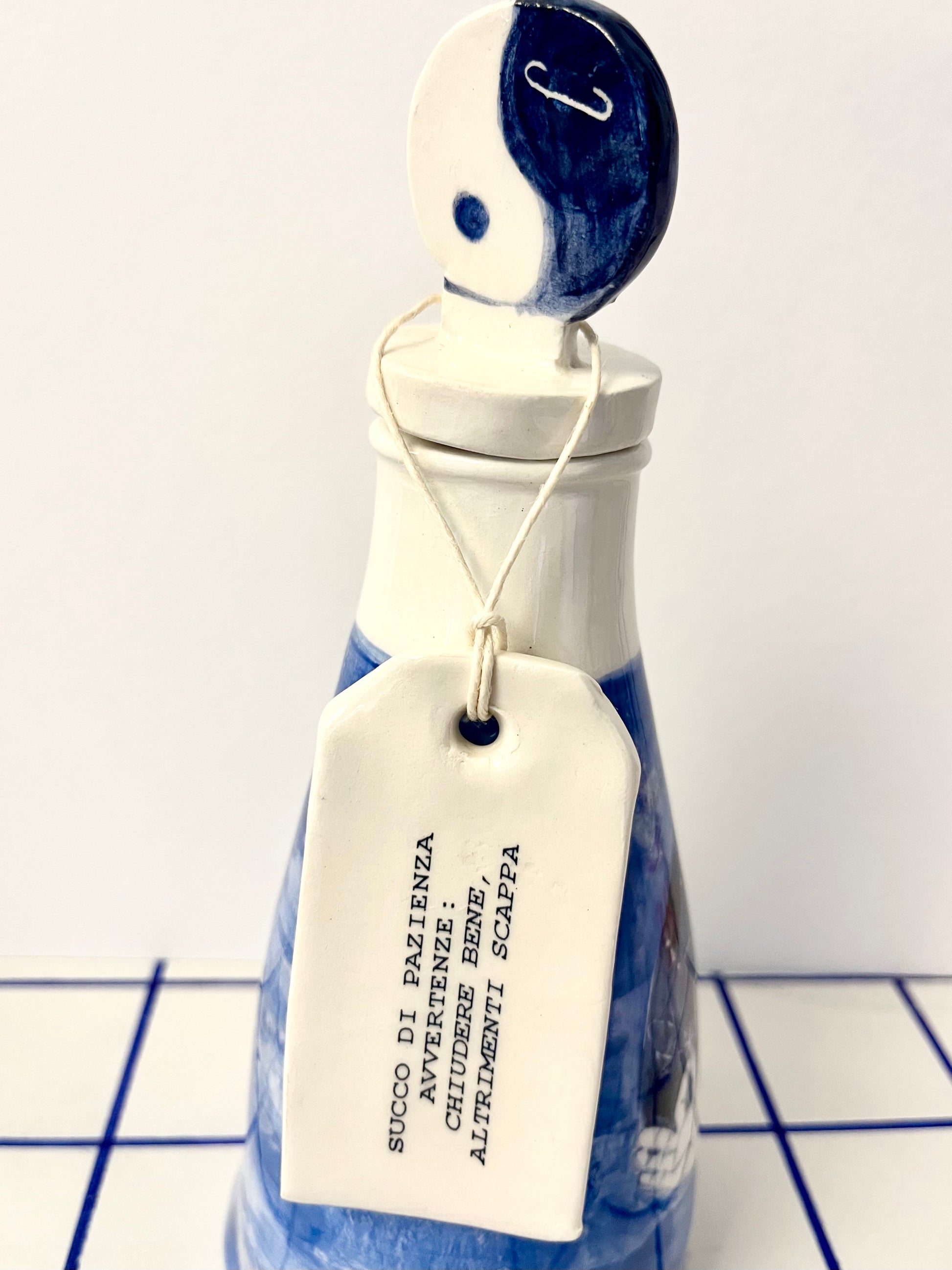 Ampolla con tappo in ceramica modellata e dipinta a mano contenente succo di pazienza con tappo, per non farla scappare.