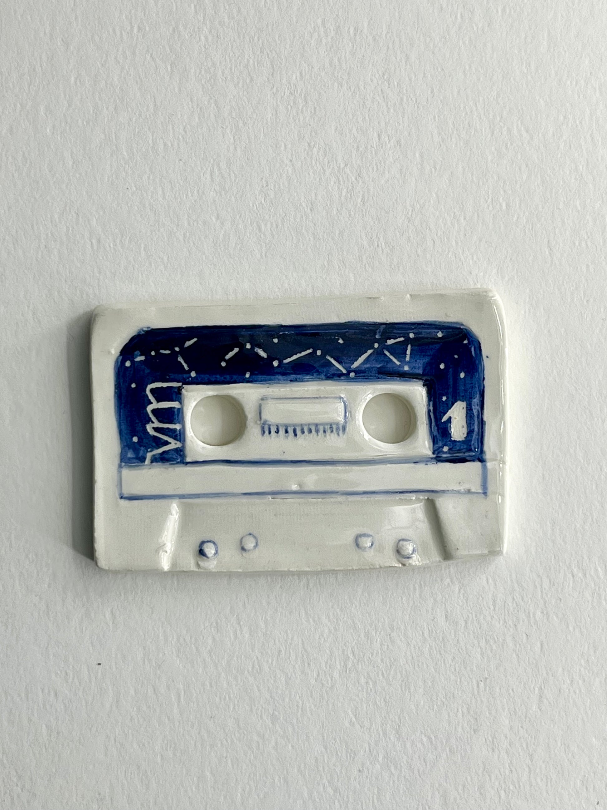 Audiocassetta in ceramica modellata e dipinta a mano da appendere al muro o da usare come suppellettile o fermacarte.