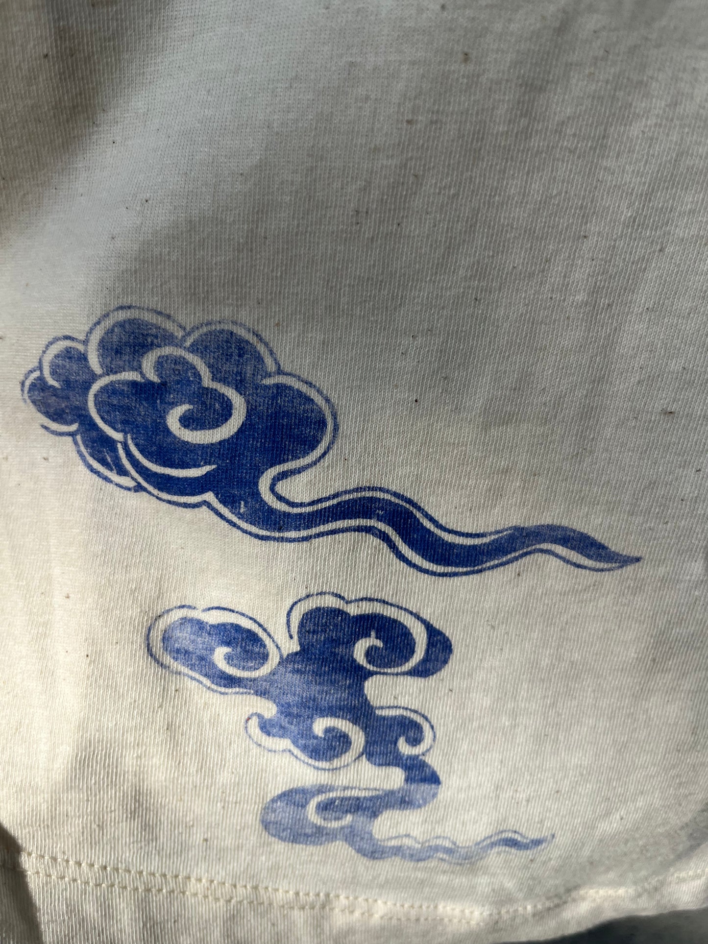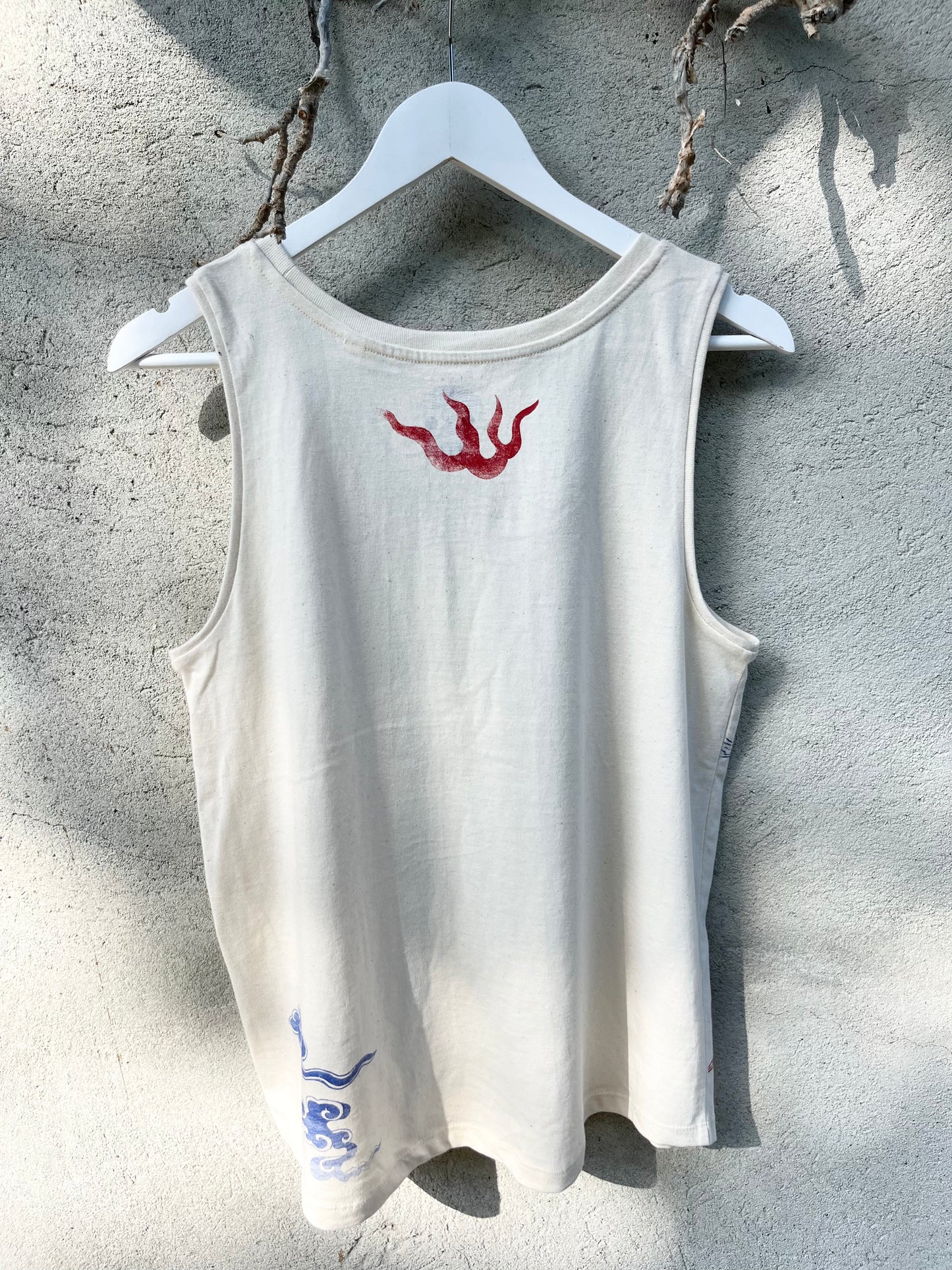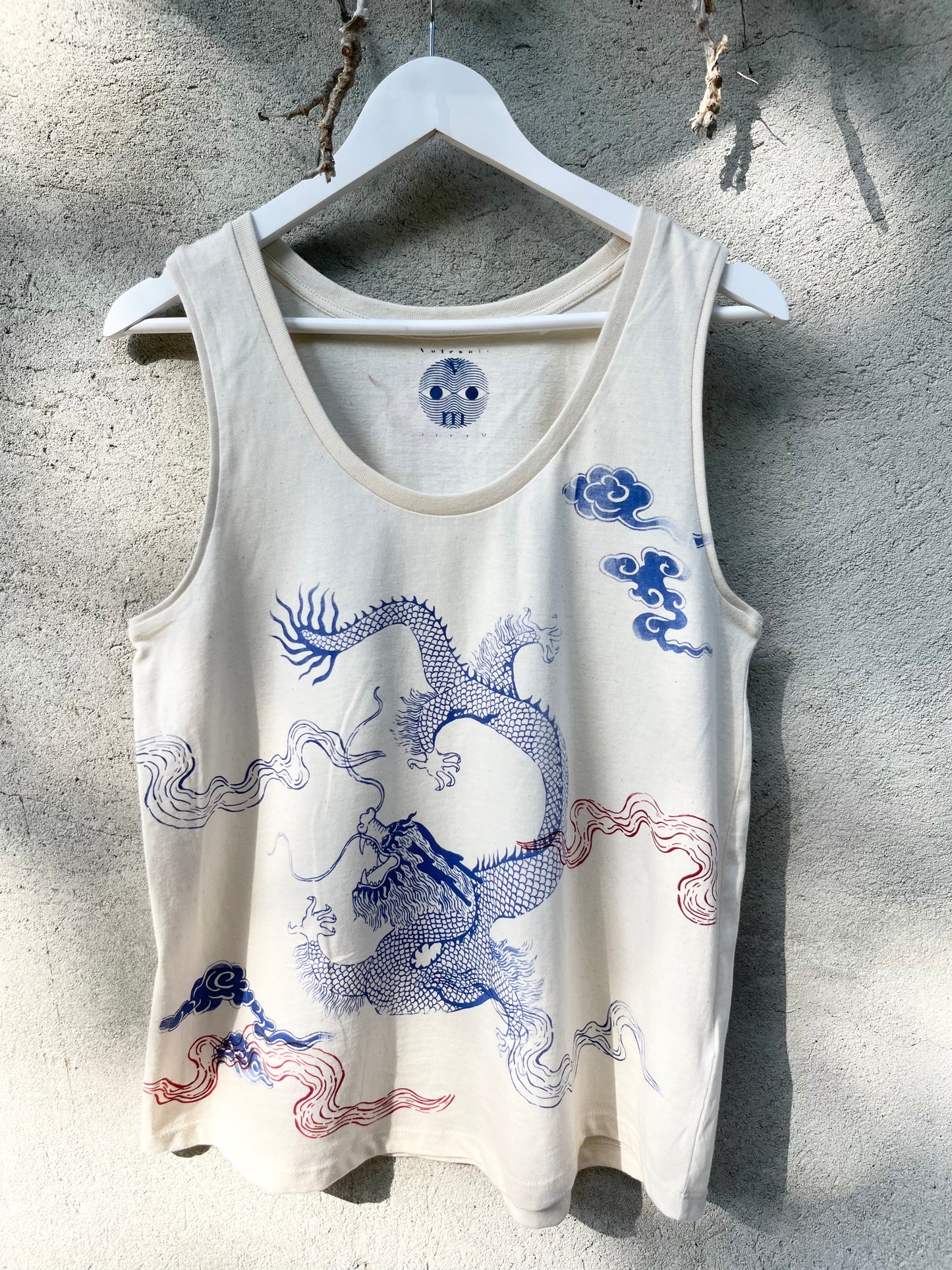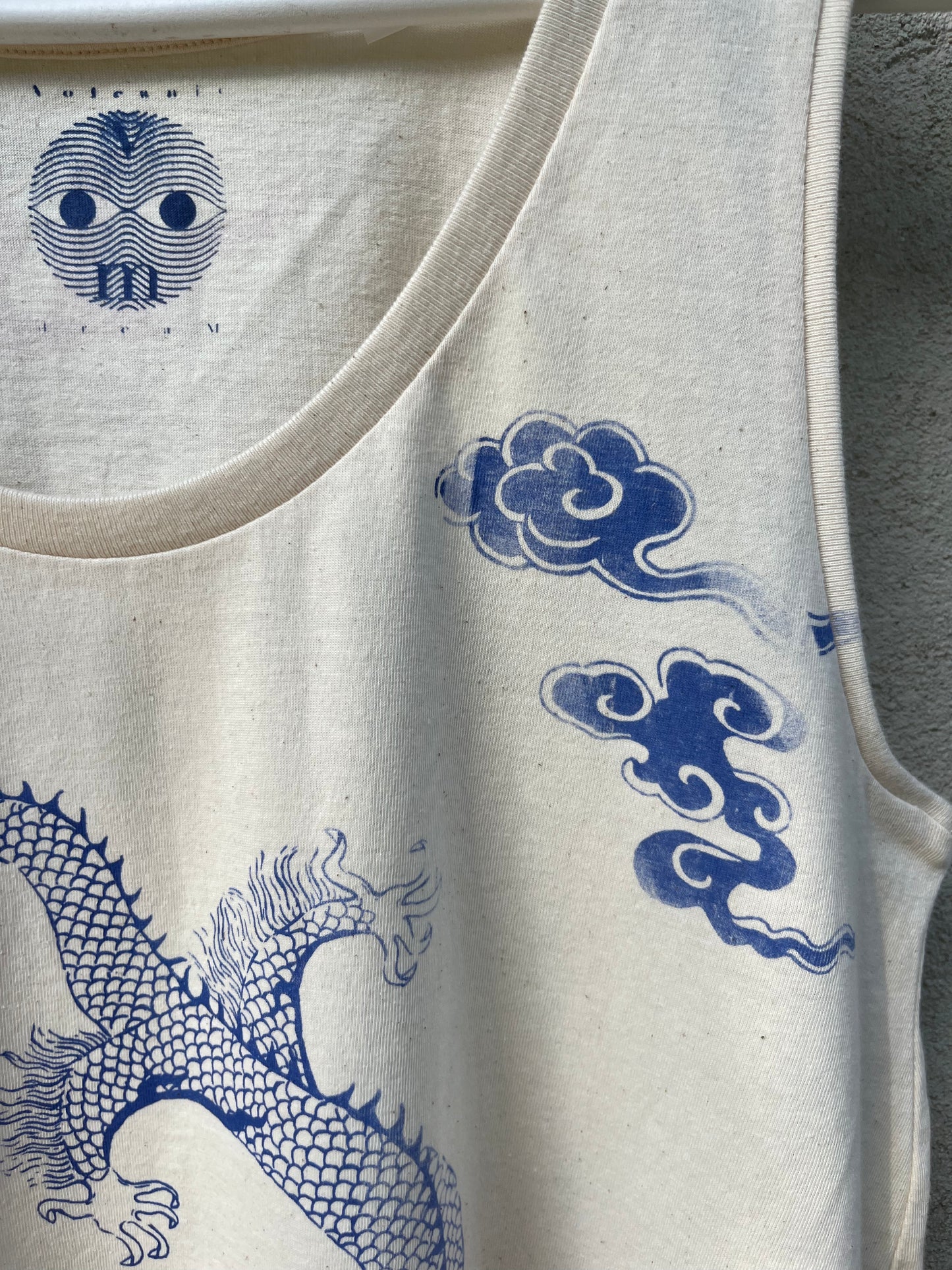 canotta color bianco o raw serigrafata con dragone blu o rosso e nuvole