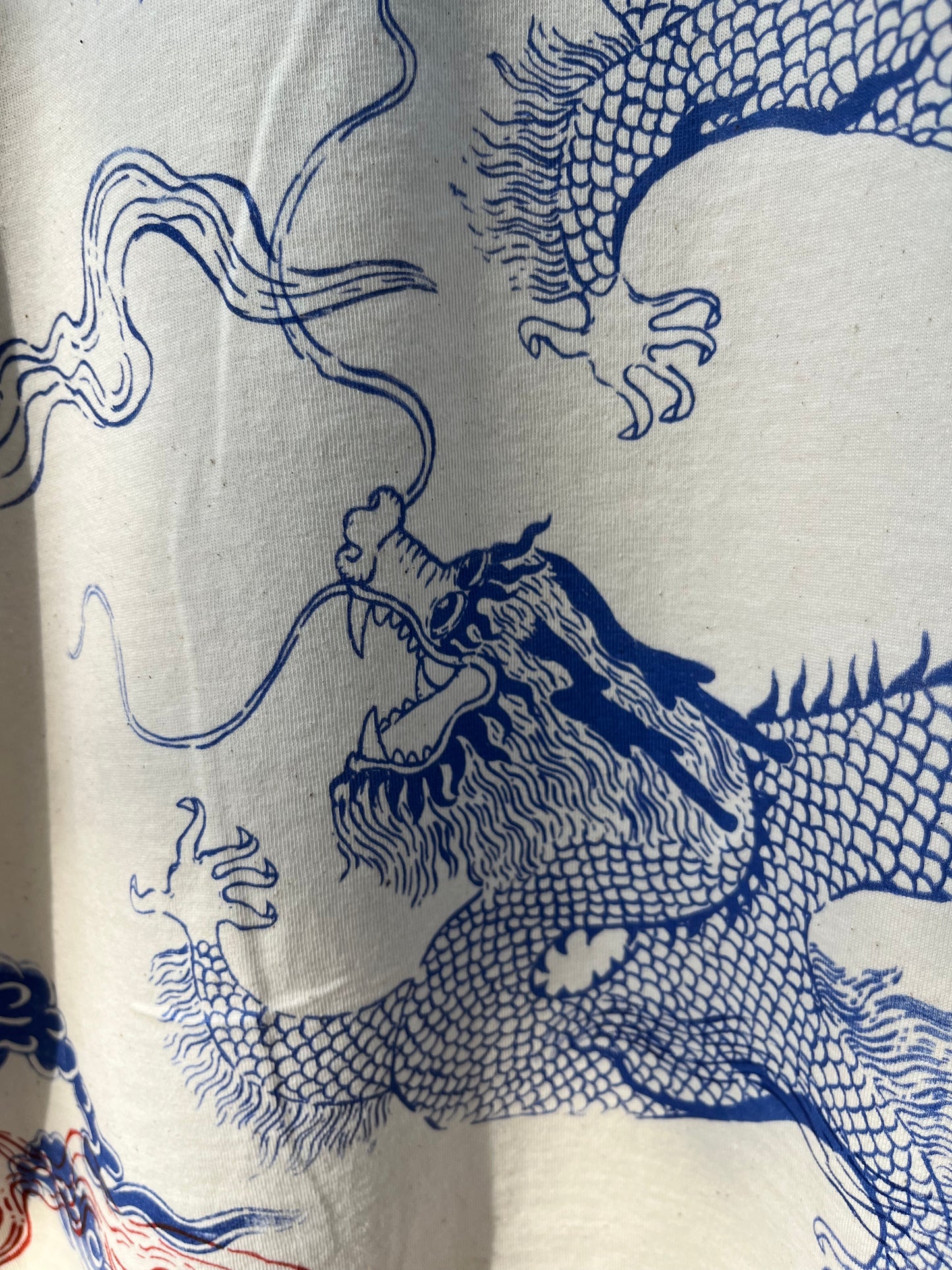 Nell'ordine, specificare la taglia e il colore del cotone, bianco o raw e quello del dragone, blu o rosso