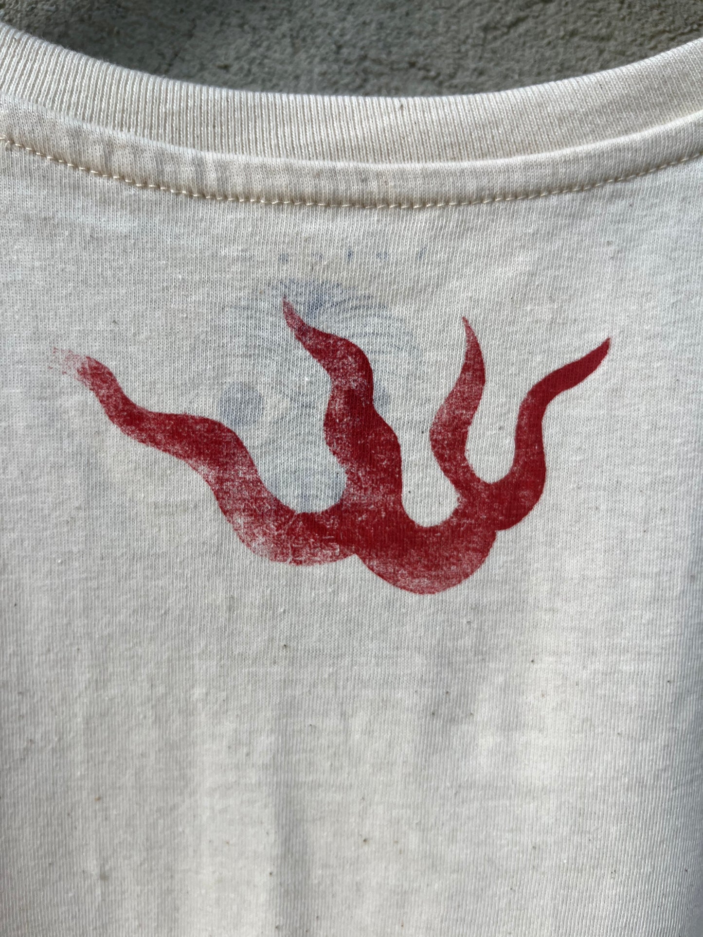 La serigrafia viene fatta manualmente, senza l'uso della giostra serigrafica, il telaio viene spostato e riposizionato manualmente ad estro dello stampatore, quindi una tshirt non sarà mai uguale ad un' altra, i singoli disegni (dragone, nuvole e fiamme) sono naturalmente uguali ma disposti sempre in maniera diversa.