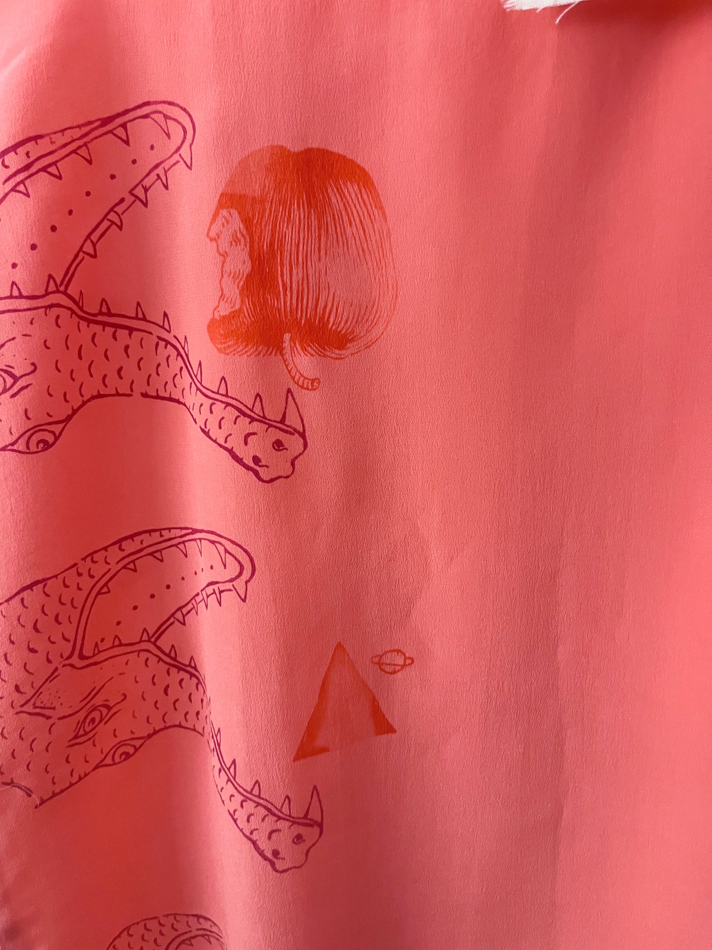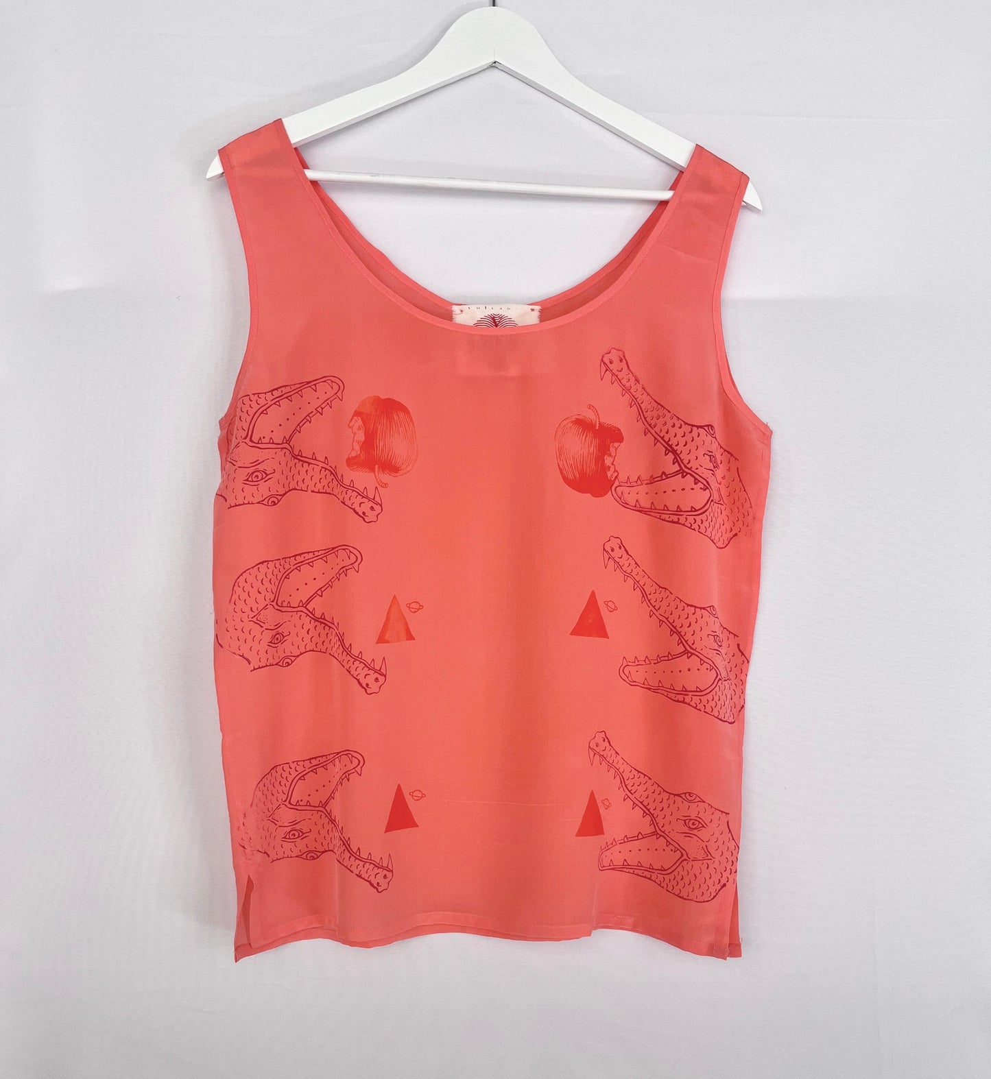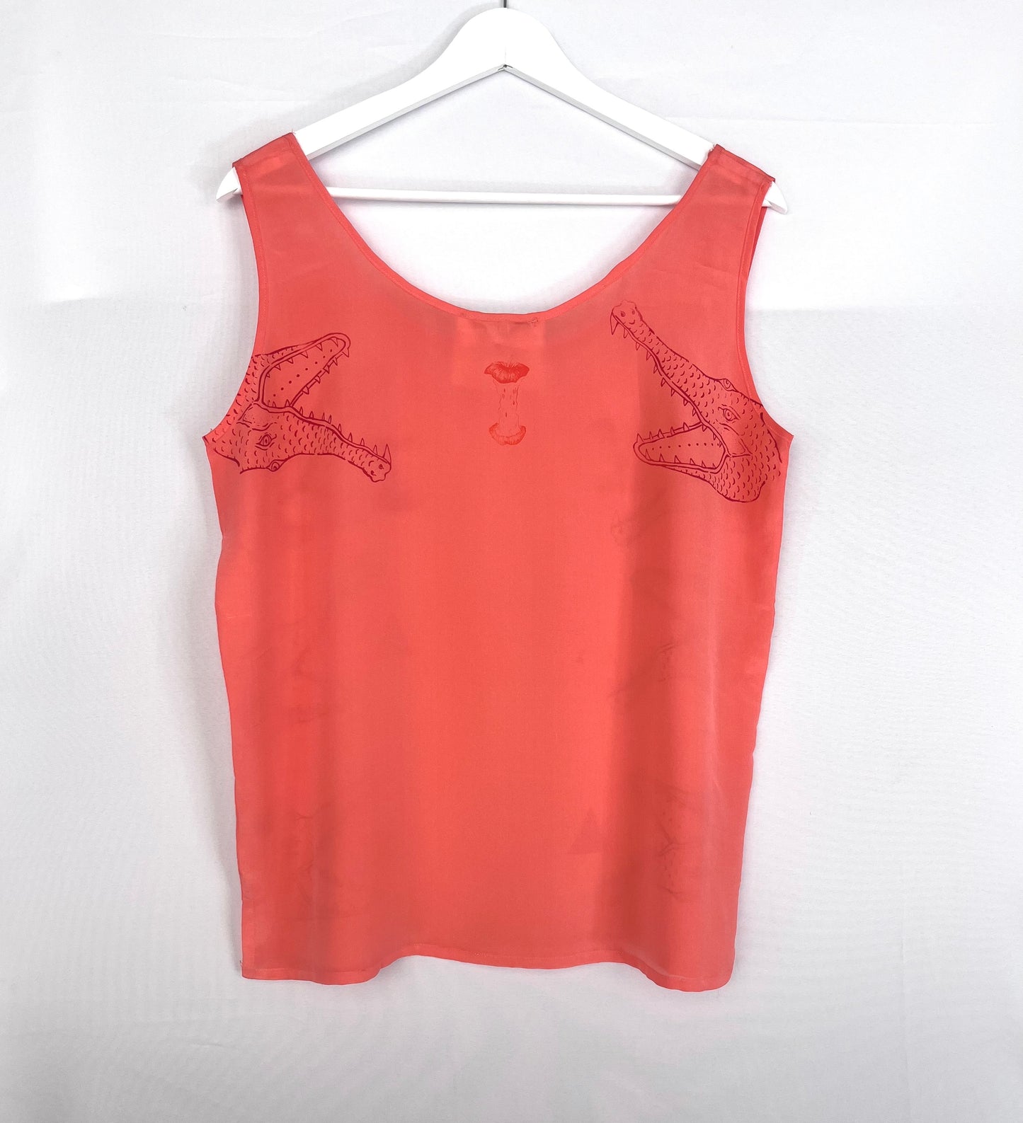 Canotta in seta deadstock color fragola serigrafata con teste di coccodrilli in lilla e mele in arancio