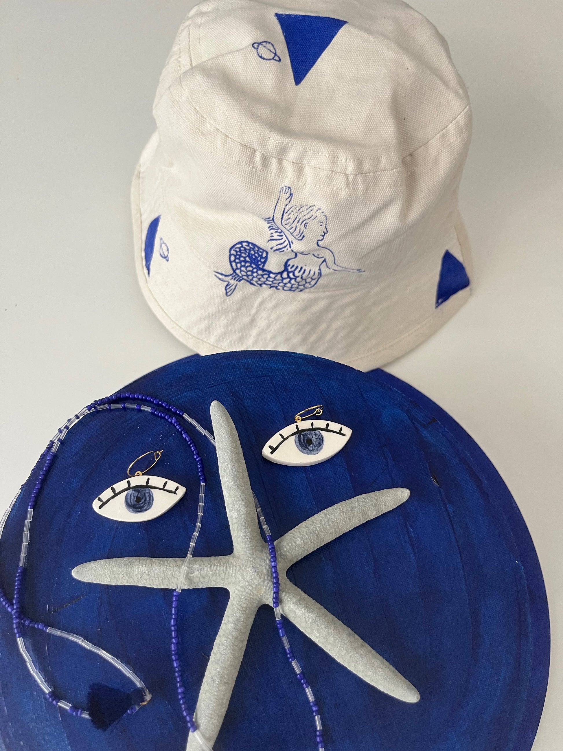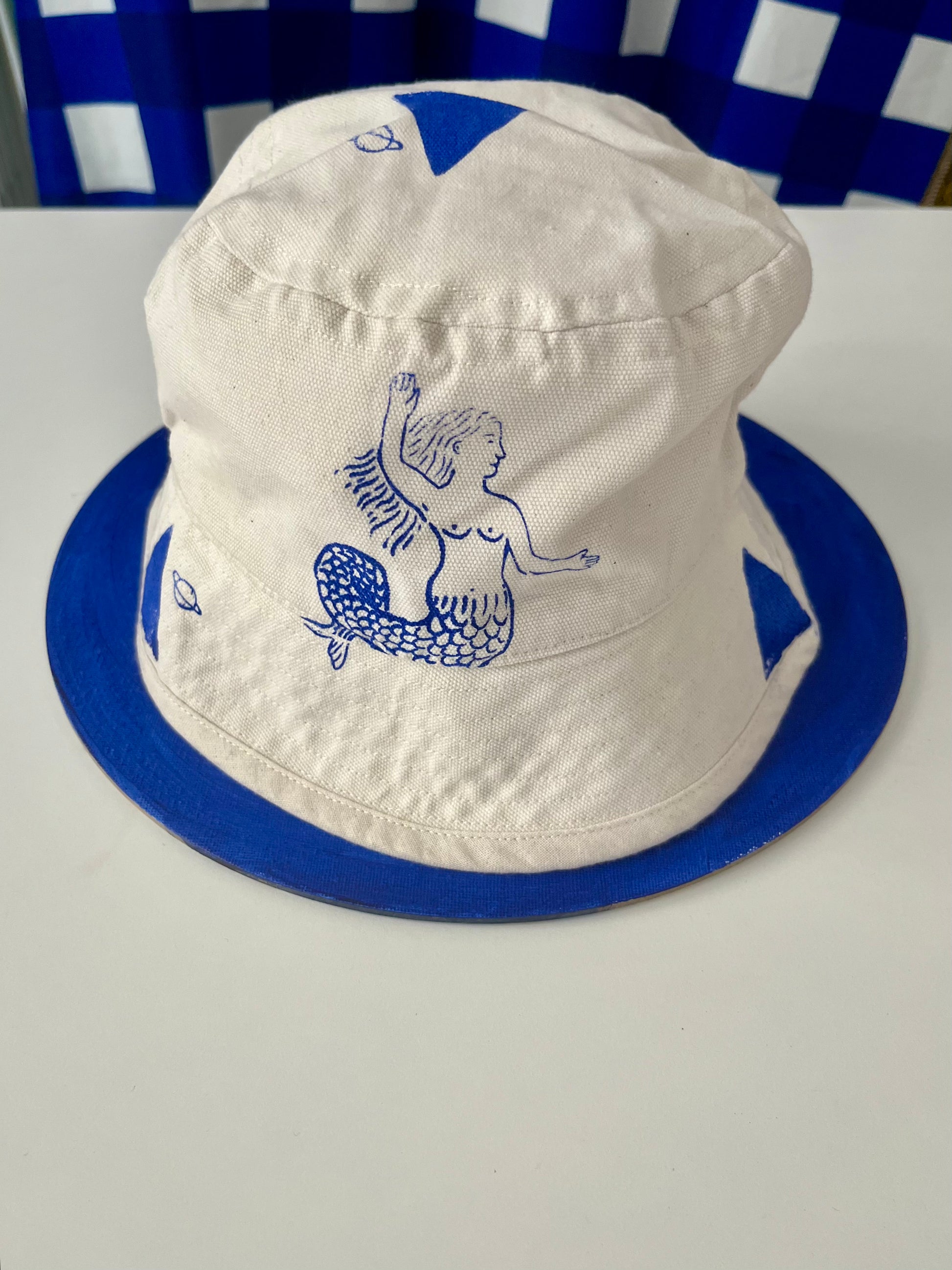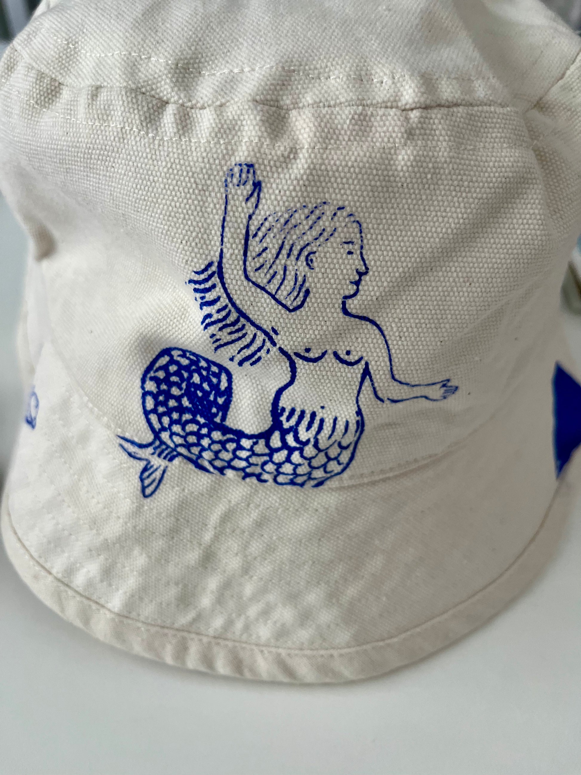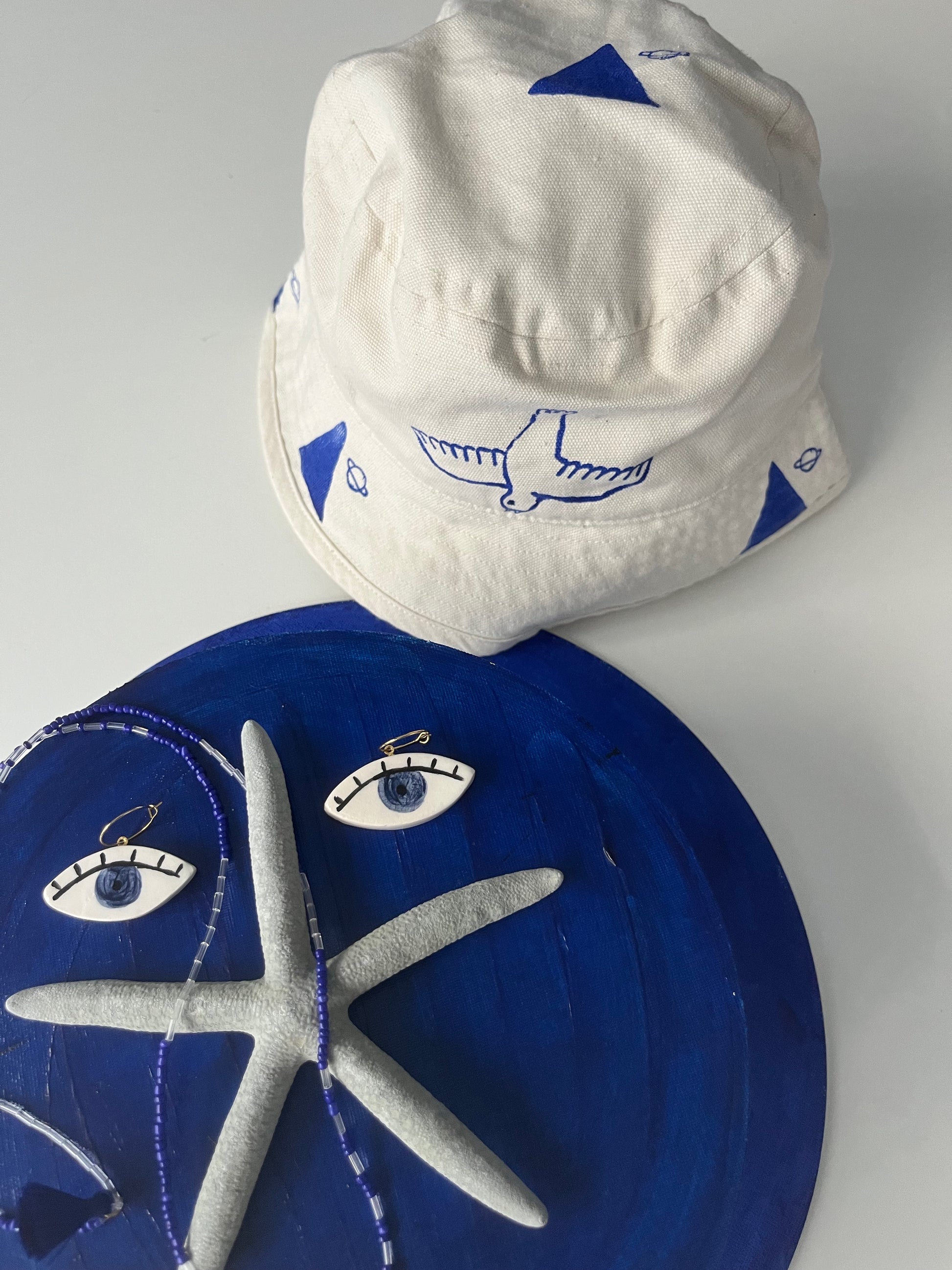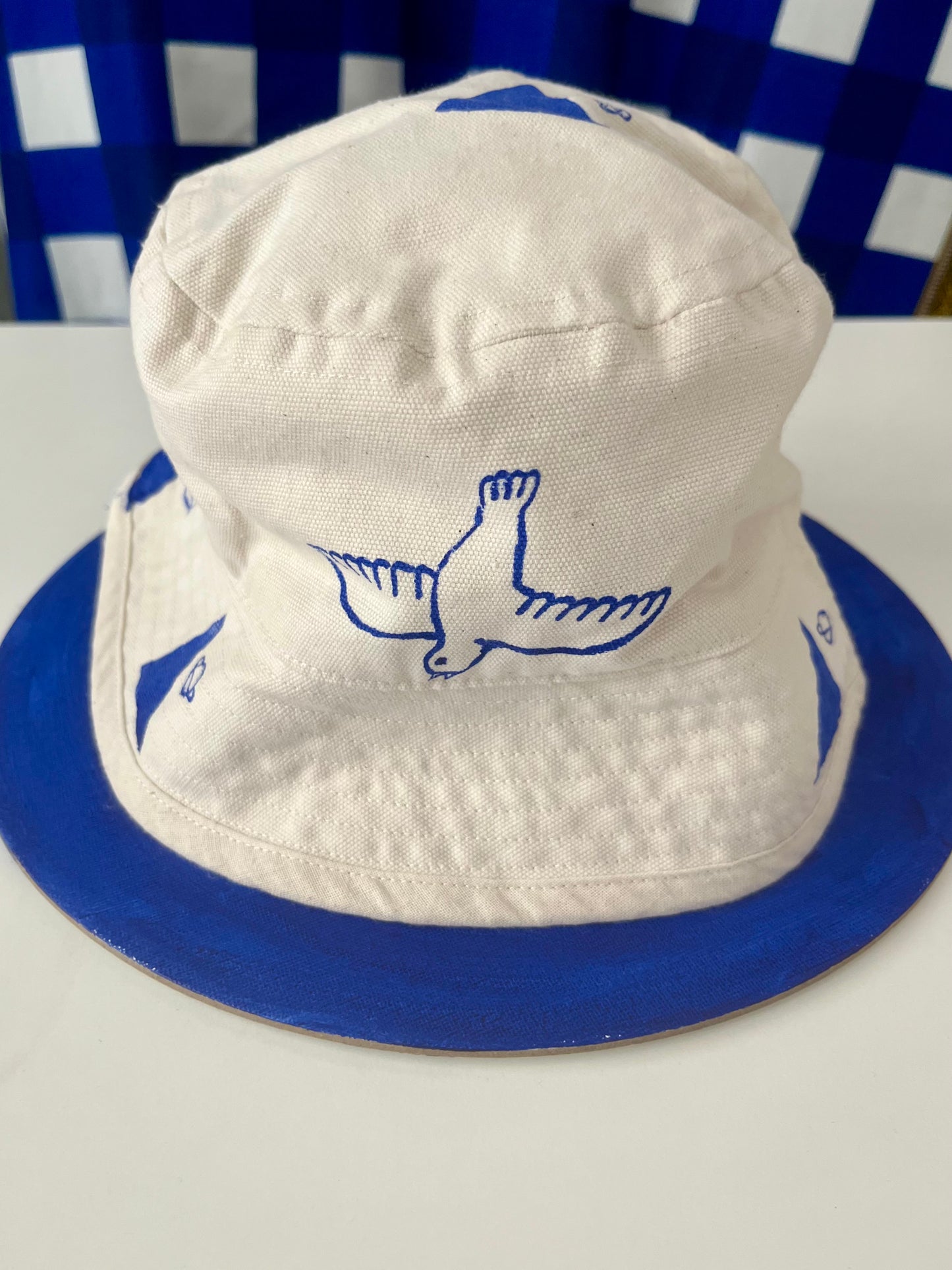 Cappellino da pescatore in canvas di cotone bianco naturale, 100% cotone, con occhielli in metallo, bordo inferiore rifinito con sbieco e doppia impuntura sulle cuciture laterali e sulla circonferenza superiore del cappello, serigrafato con motivi marini originali vulcanici.