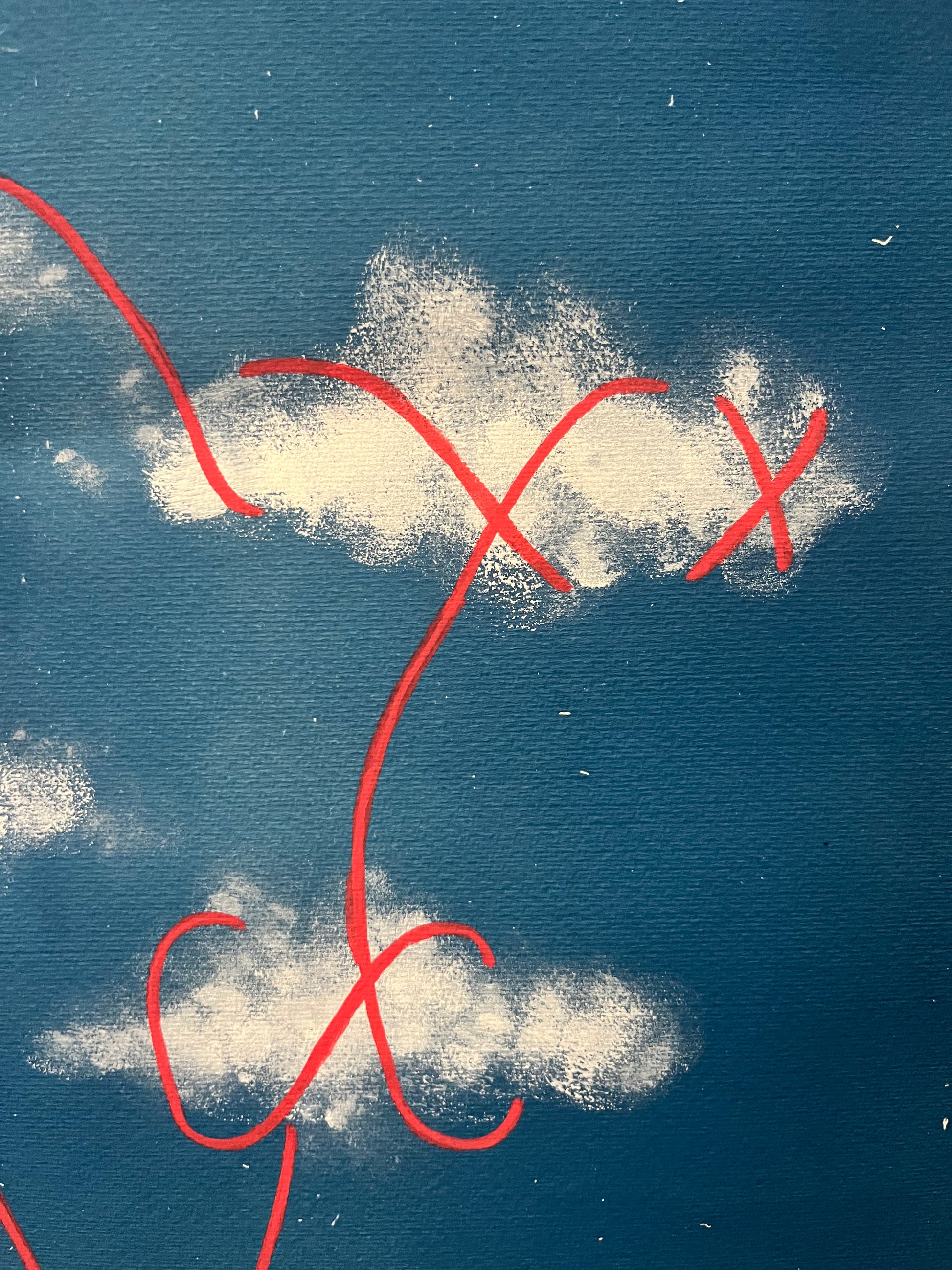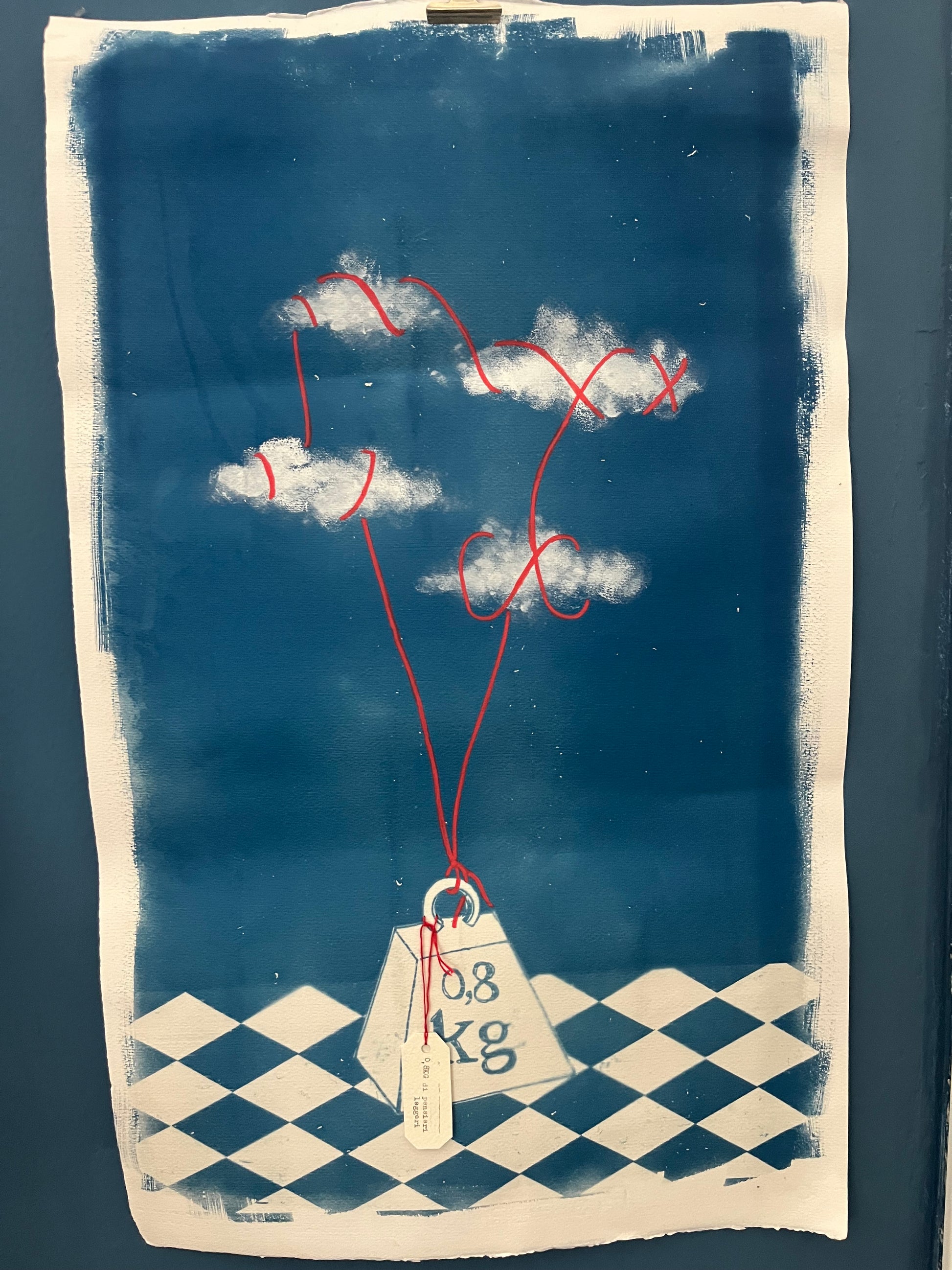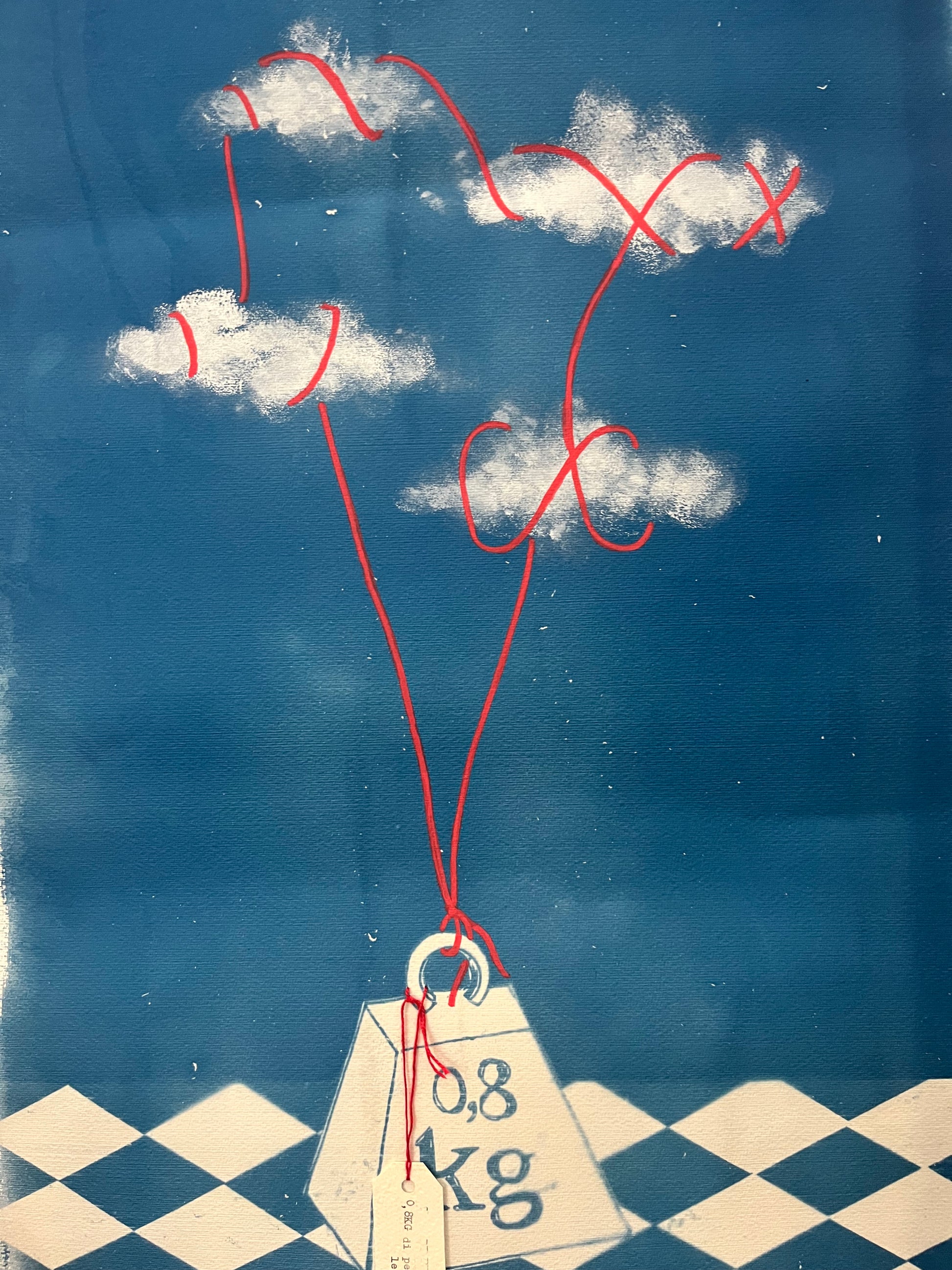 Il cielo ciano, il pavimento e il peso sono ottenuti tramite la cianotipia di disegni vulcanici e realizzata con il sole del pianeta pisello di fine estate, le nuvole e il filo rosso sono fatte in acrilico, l'etichetta è cucita al peso con un filo di cotone rosso e la didascalia stampata con la macchina da scrivere Olivetti, lettera 22.