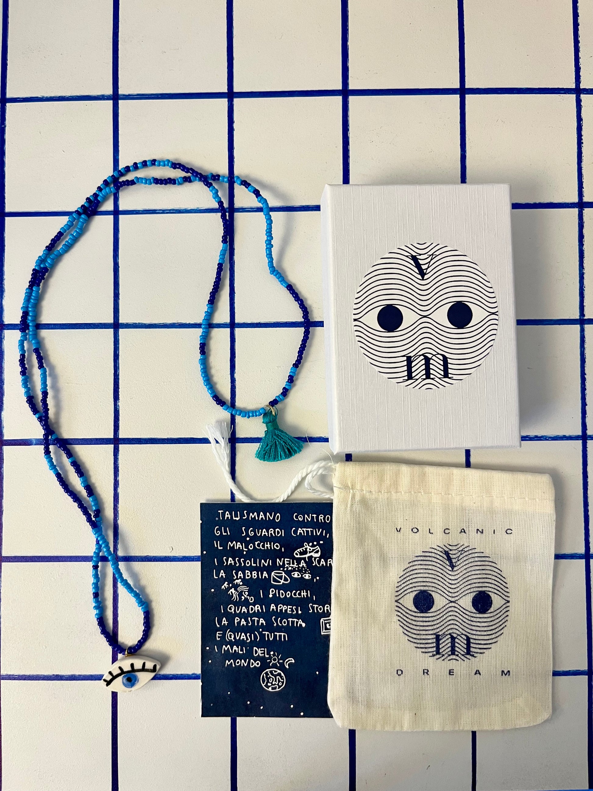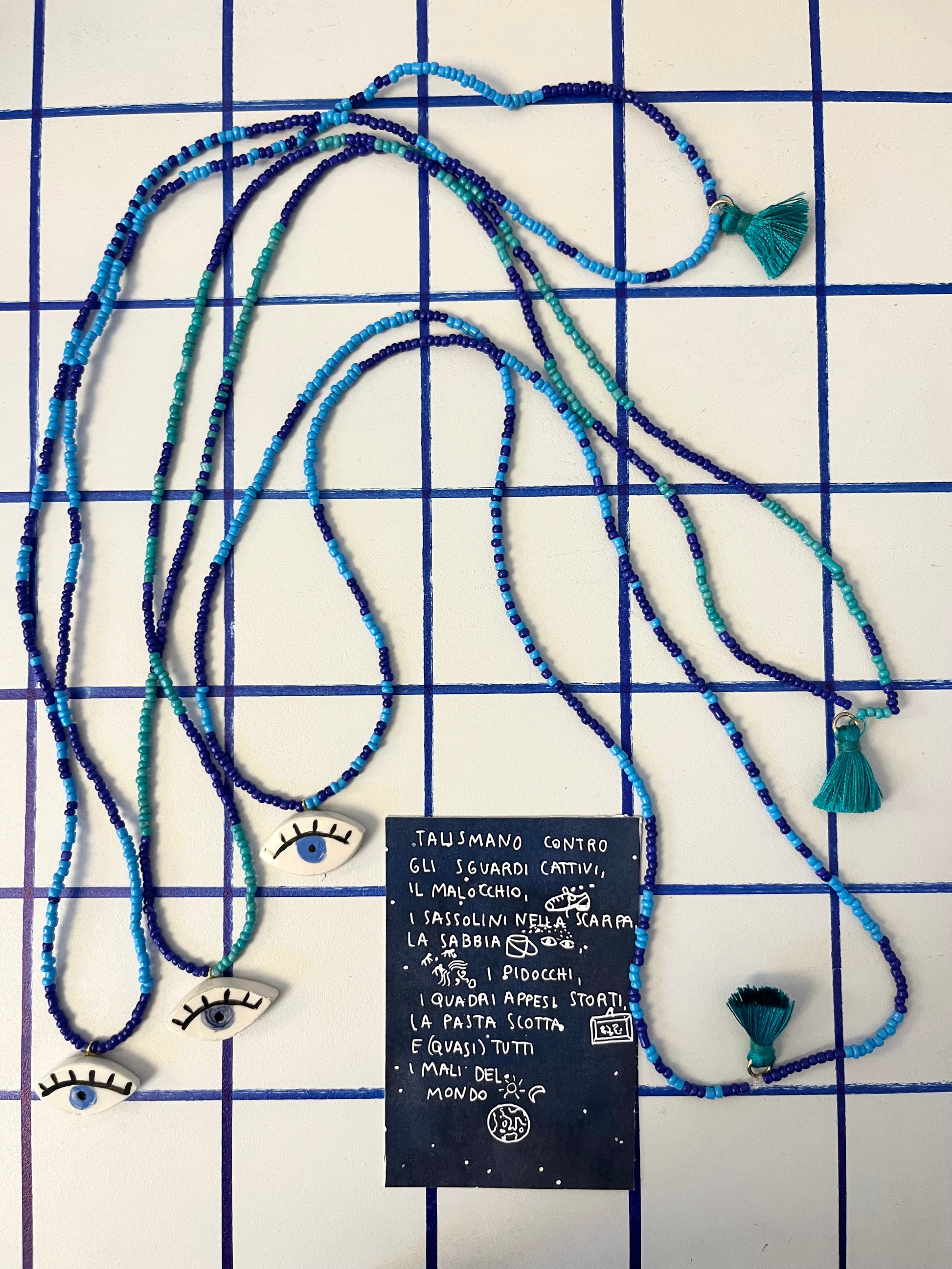 1. Collana talismano con pendente a forma di occhio e perline in vetro color blu klein intervallate da perline color azzurro cielo limpido e nappa. L'occhio, grande 23x12 mm circa, con l'iride azzurro cielo e il fronte lucido, è in ceramica modellato e dipinto a mano, ognuno è diverso dall'altro.