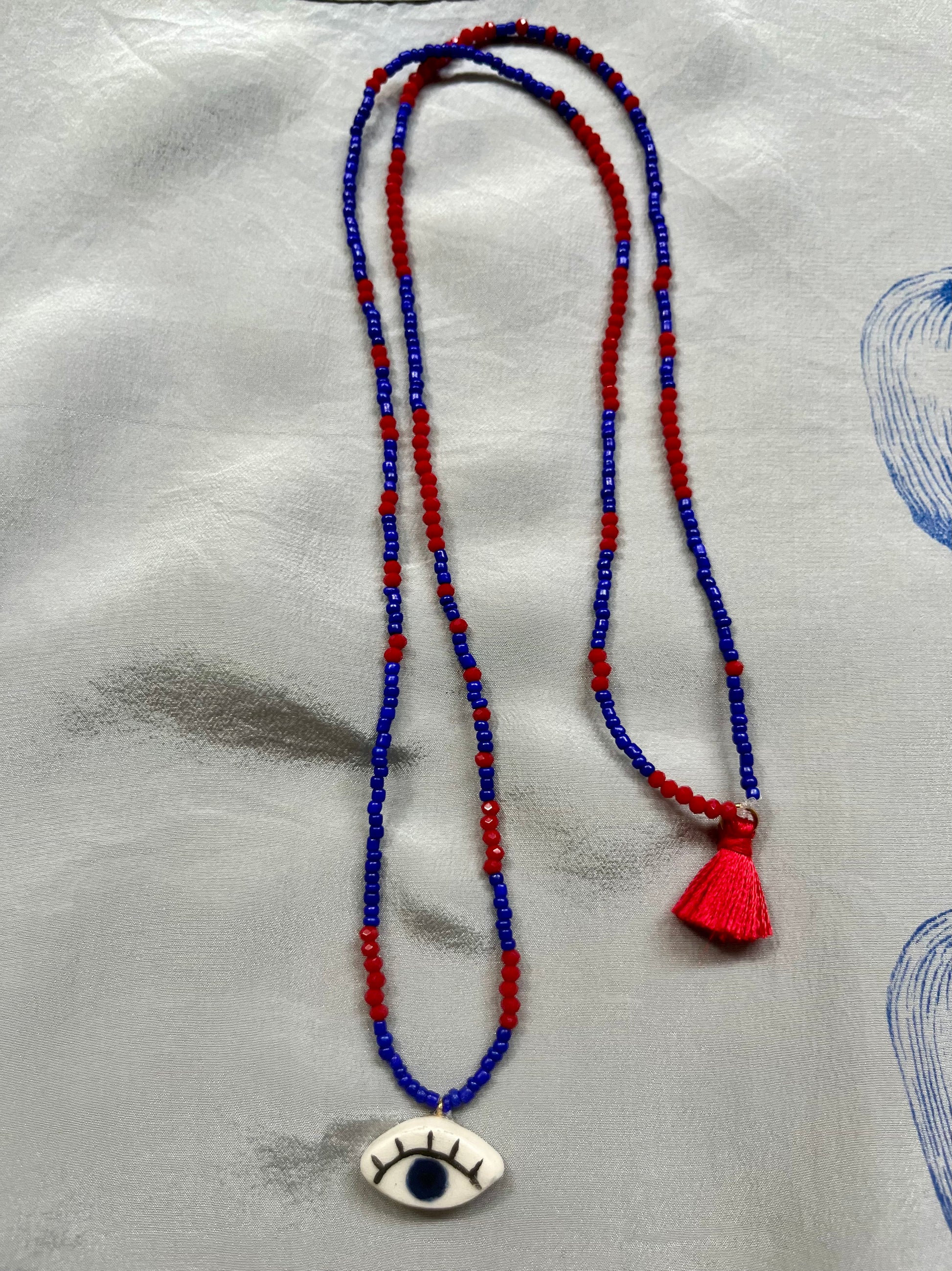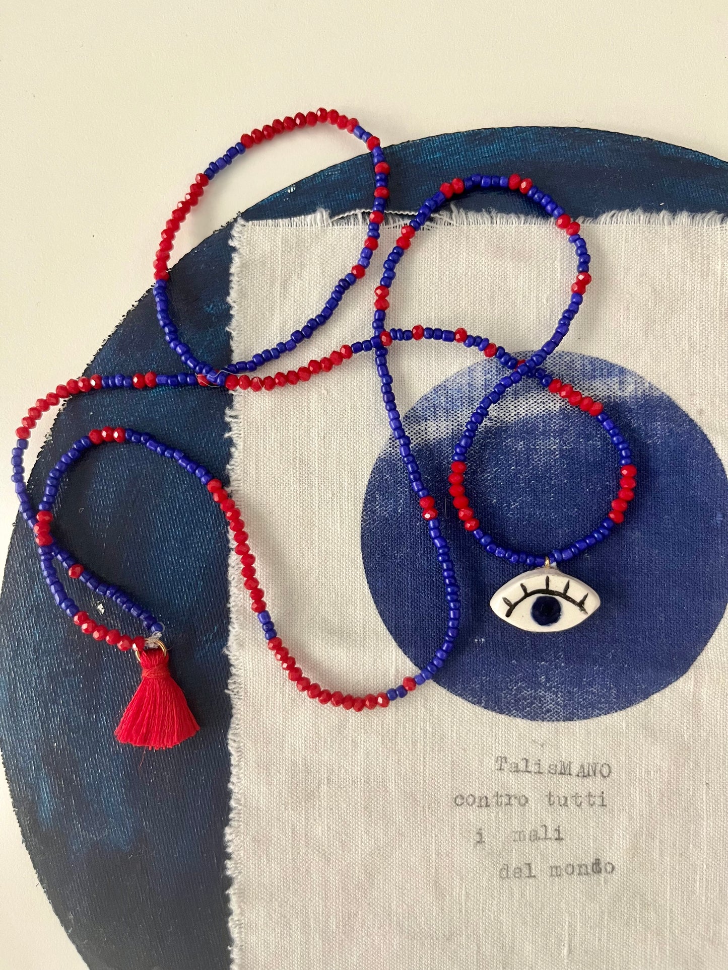 Collana talismano contro quasi tutti i mali del mondo ;) con pendente a forma di occhio, perline in vetro color blu klein intervallate da perline color rosso acceso e nappa.