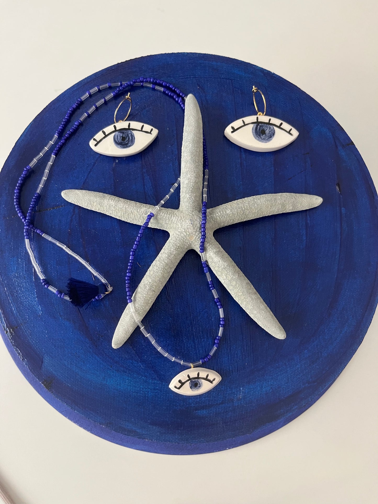 L'occhio in ceramica, grande 18x10 mm circa, con l'iride blu notte e il fronte lucido, è modellato e dipinto a mano, ognuno è quindi diverso da un altro.