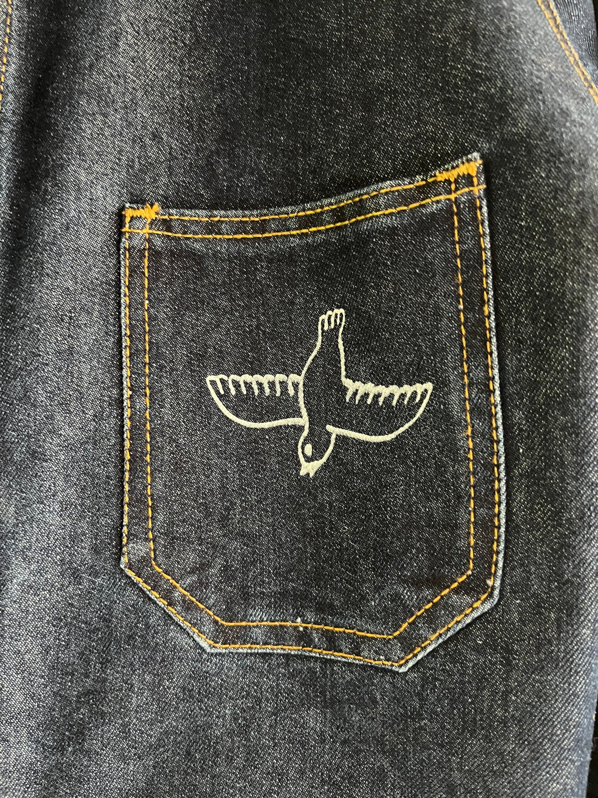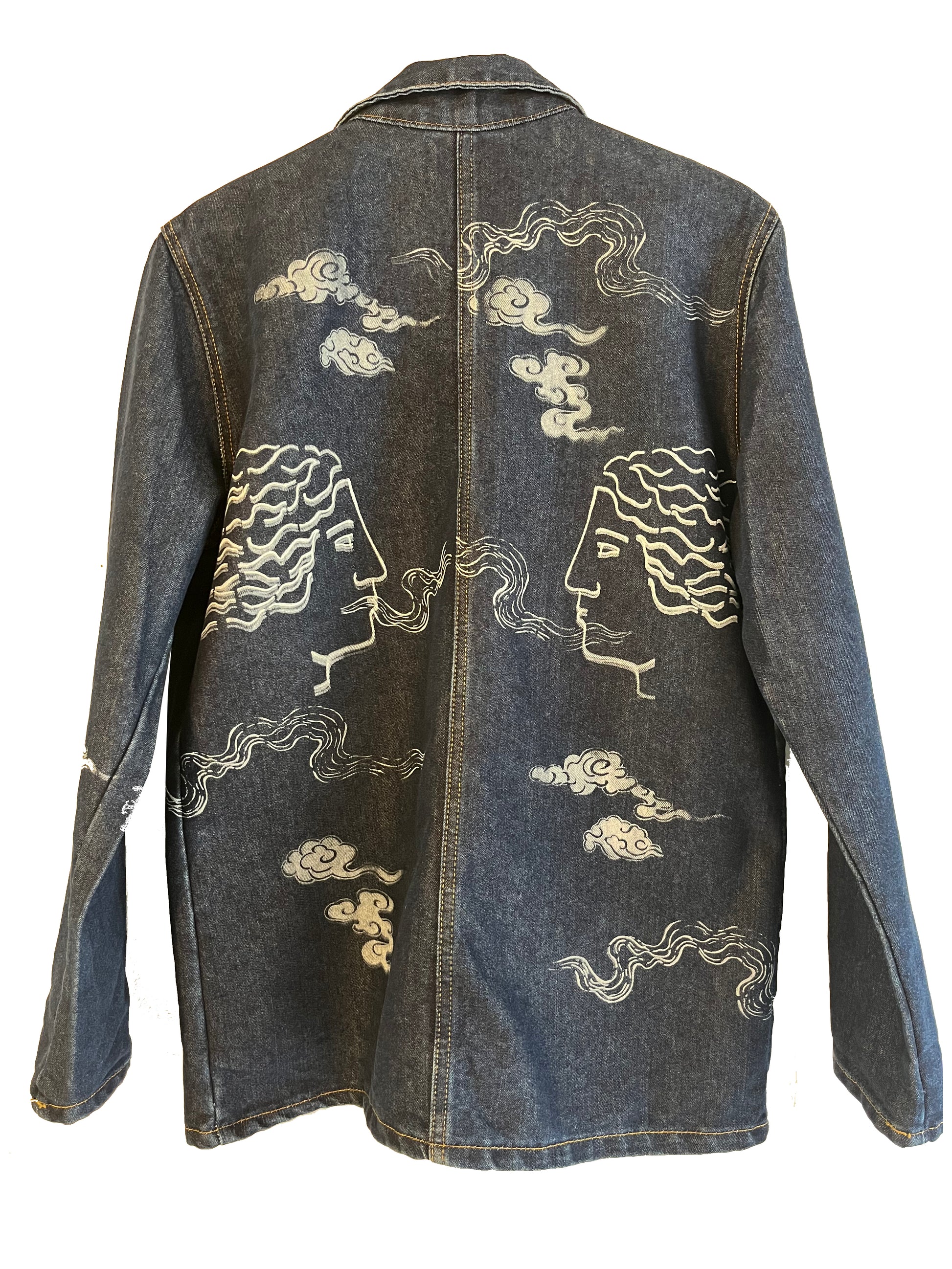 Il colore della giacca è denim blu scuro serigrafata in bianco con il vulcano due profili di statue greche in mezzo a nuvole cinesi sul retro e l'uccello della creazione con nuvole sul davanti