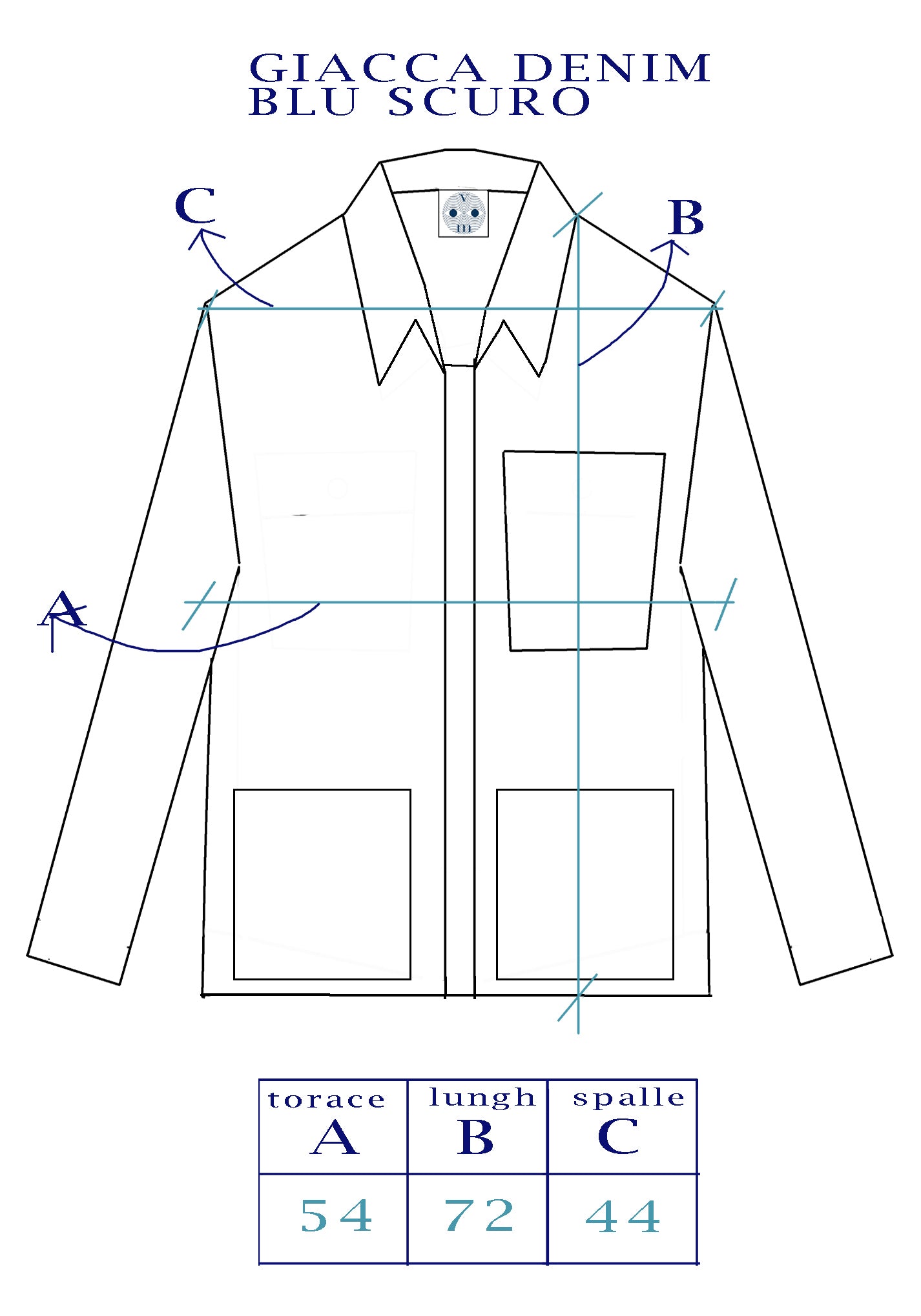 In 100% cotone denim spesso, peso 300 gr/mq circa, con collo aperto, 1 tasche sul cuore, due sui fianchi, misura S, le misure sono riportate nell'ultima immagine.