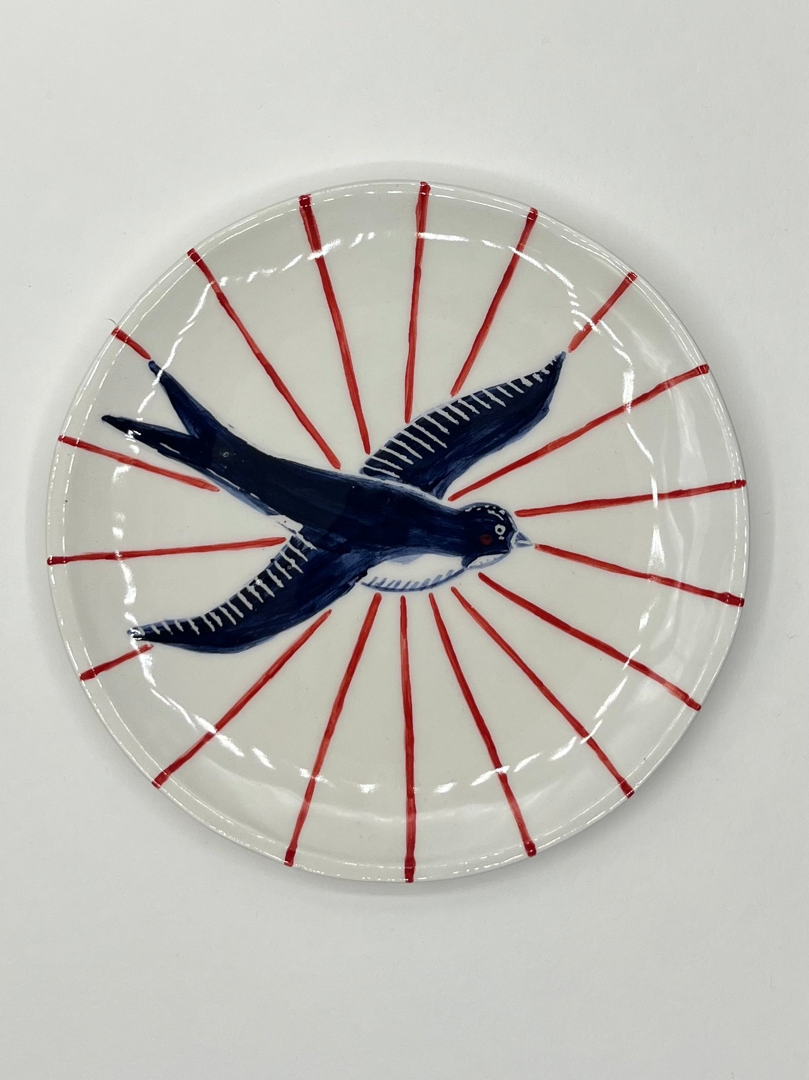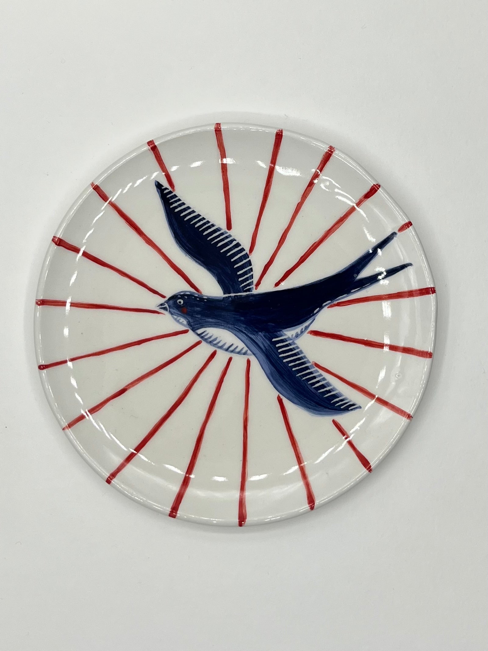 Piattini in ceramica modellati e dipinti a mano con rondine blu profondo e raggiera rosso fuoco. La finitura brillante è apiombica, adatta ad uso alimentare.