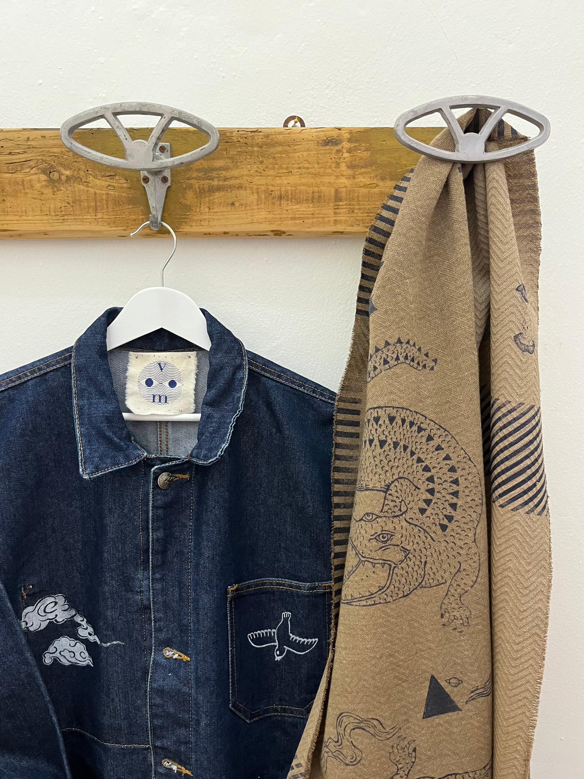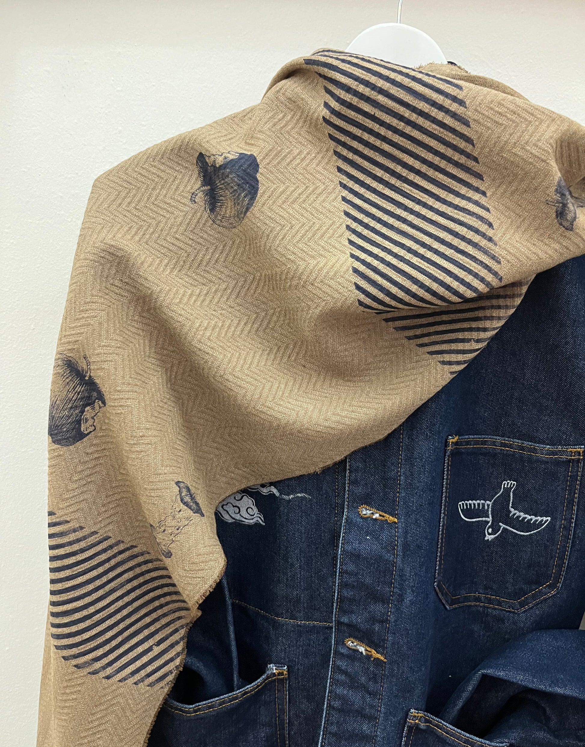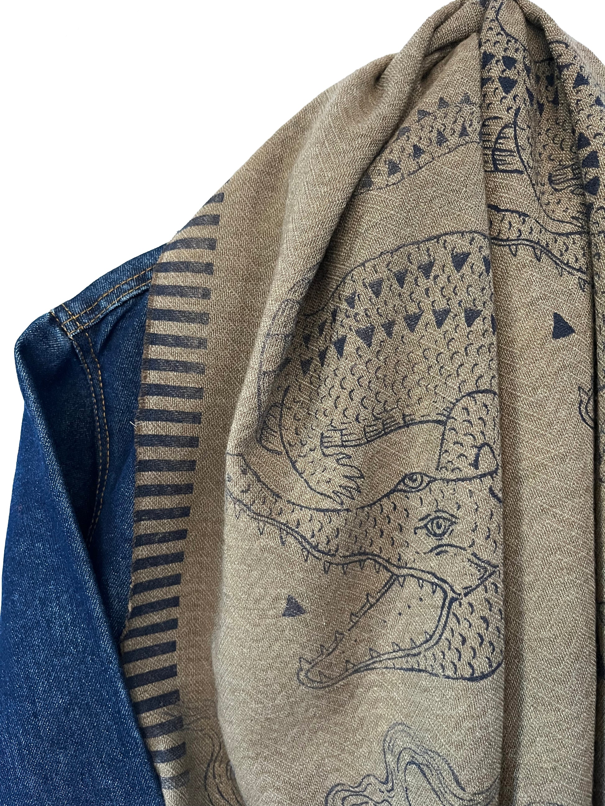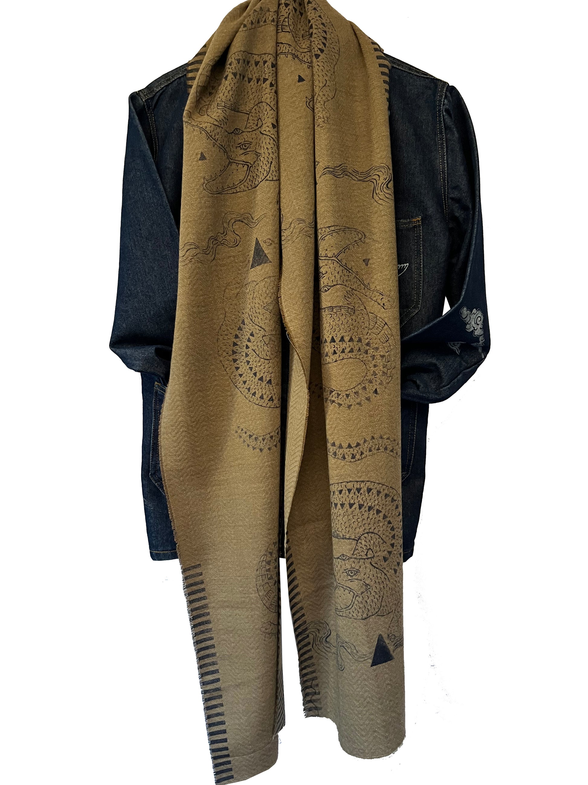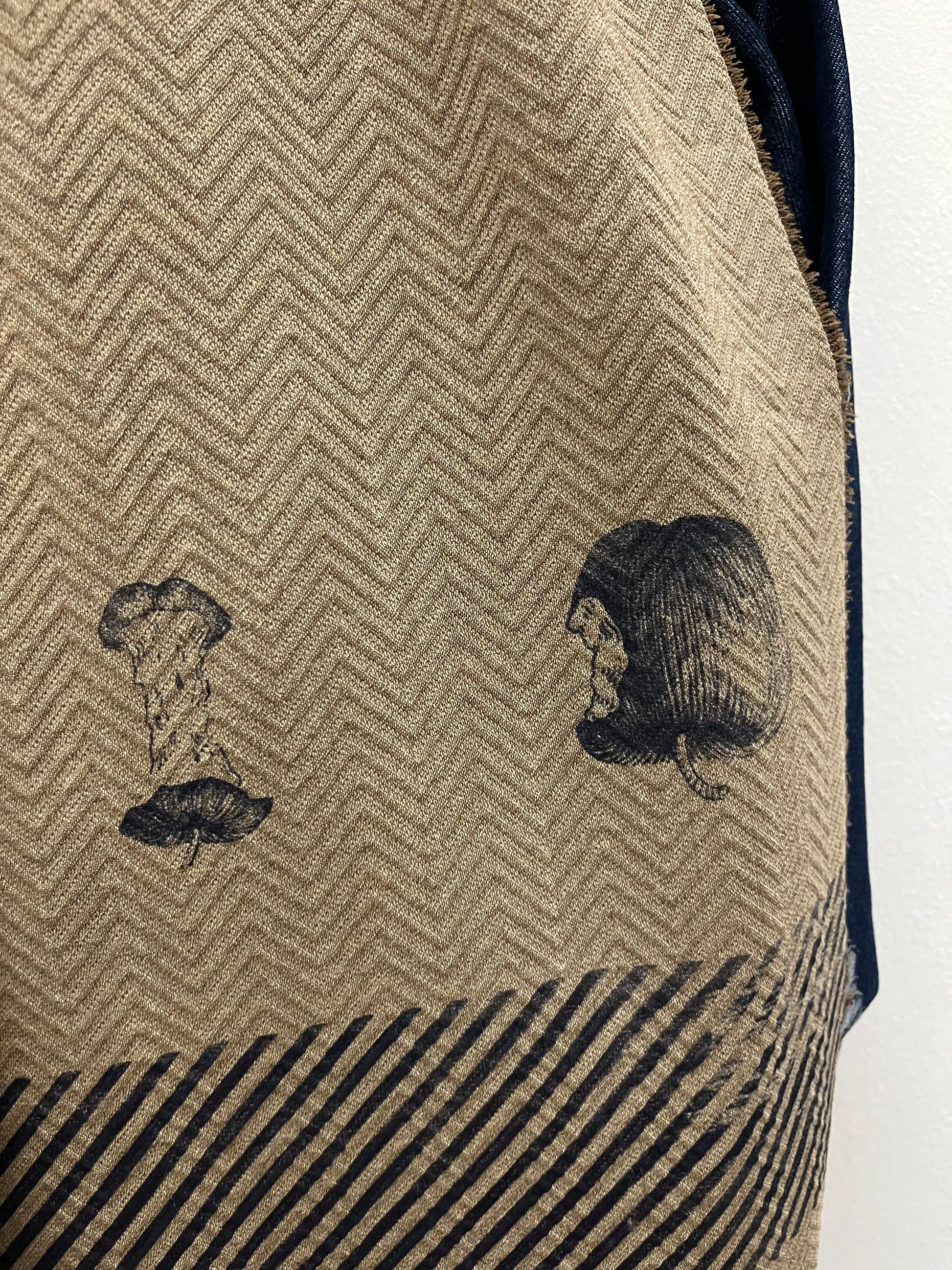 Sciarponi ottenuti da tessuti deadstock di grandi case made in Italy, 100% lana, con motivo jackard zig zag colore cammello serigrafate in bianco con soggetti vulcanici.