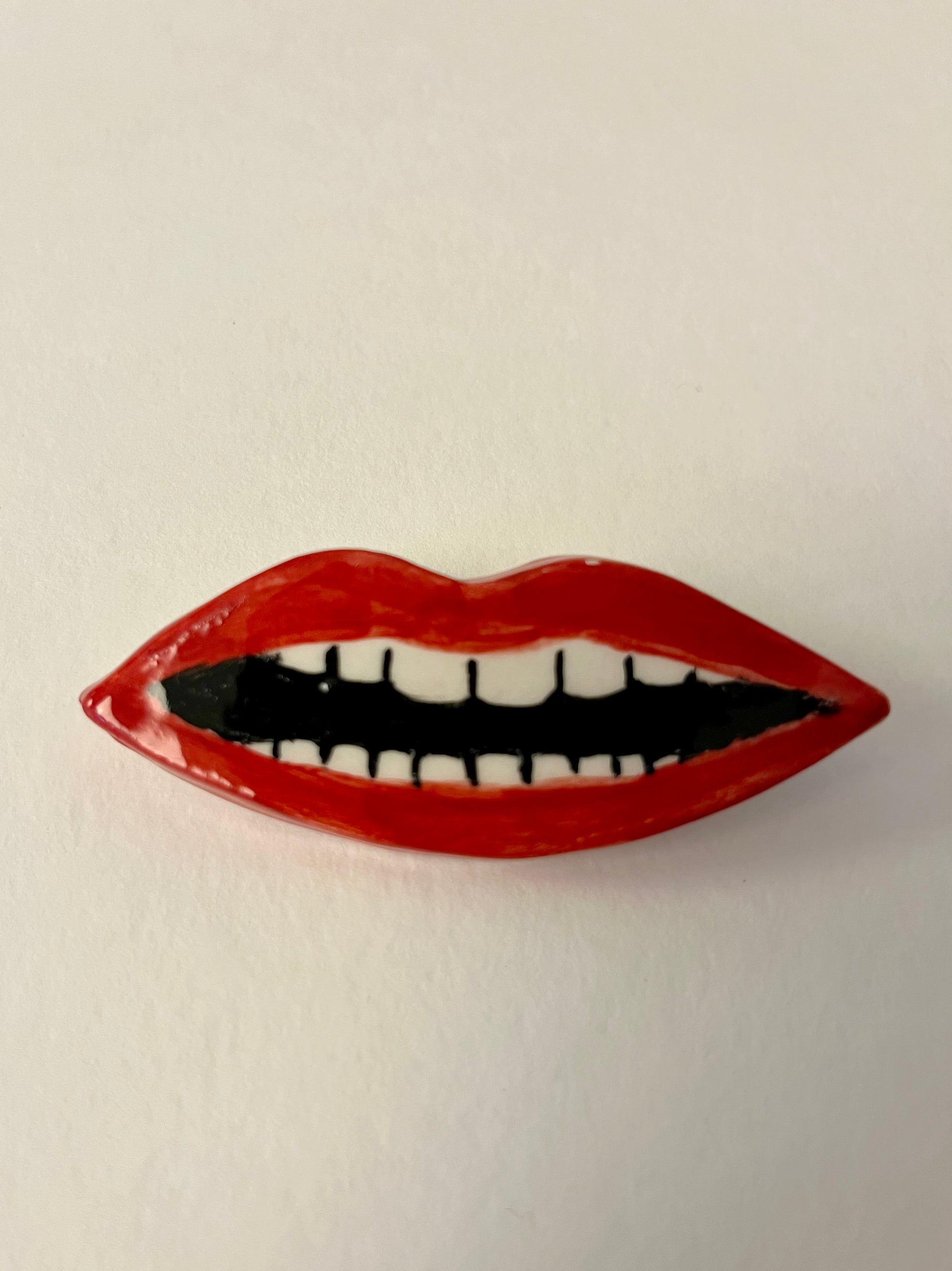 Spille a forma di bocca in ceramica modellate e dipinte a mano, una diversa dall’altra. Le labbra sono dipinte rosso fuoco e l’interno è blu notte o nero.