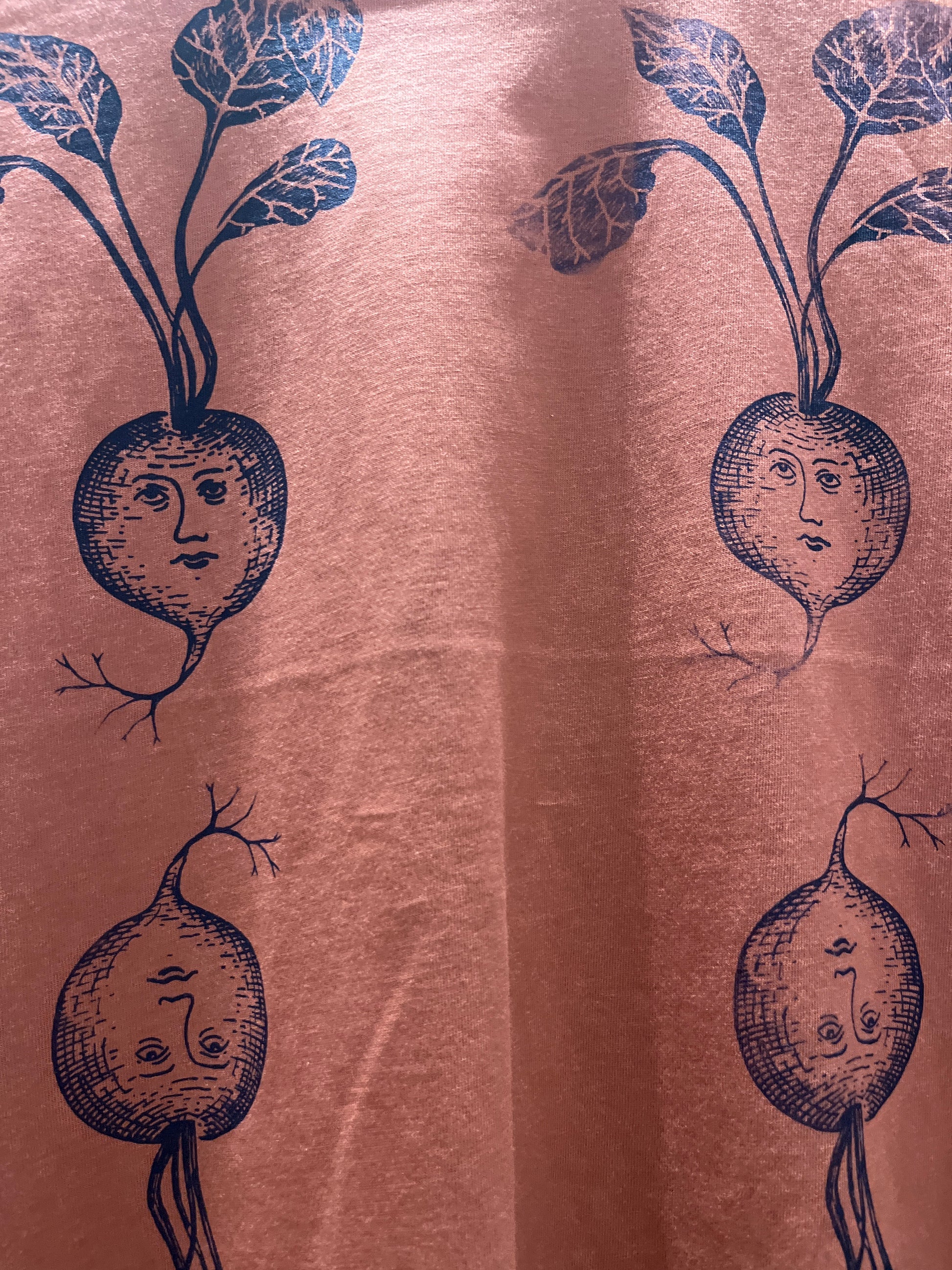 T-shirt cotone organico terracotta serigrafata con rapanelli barbabietole