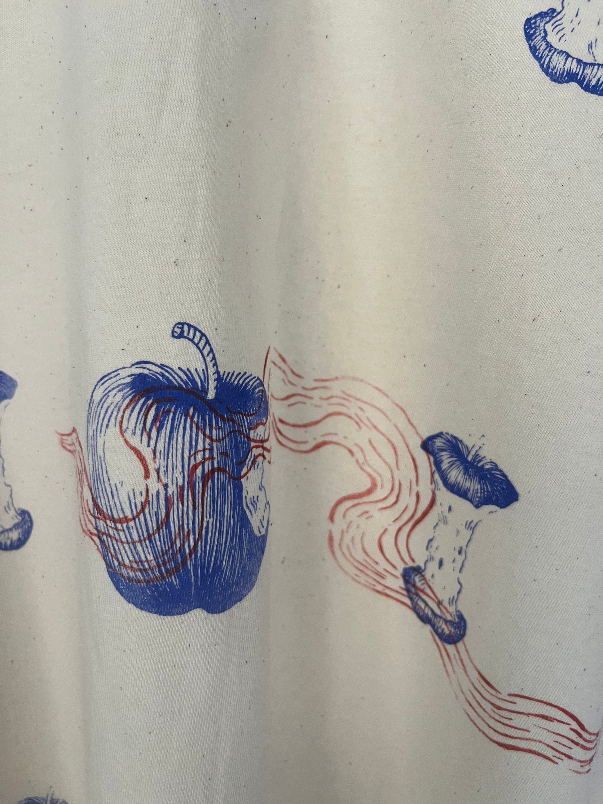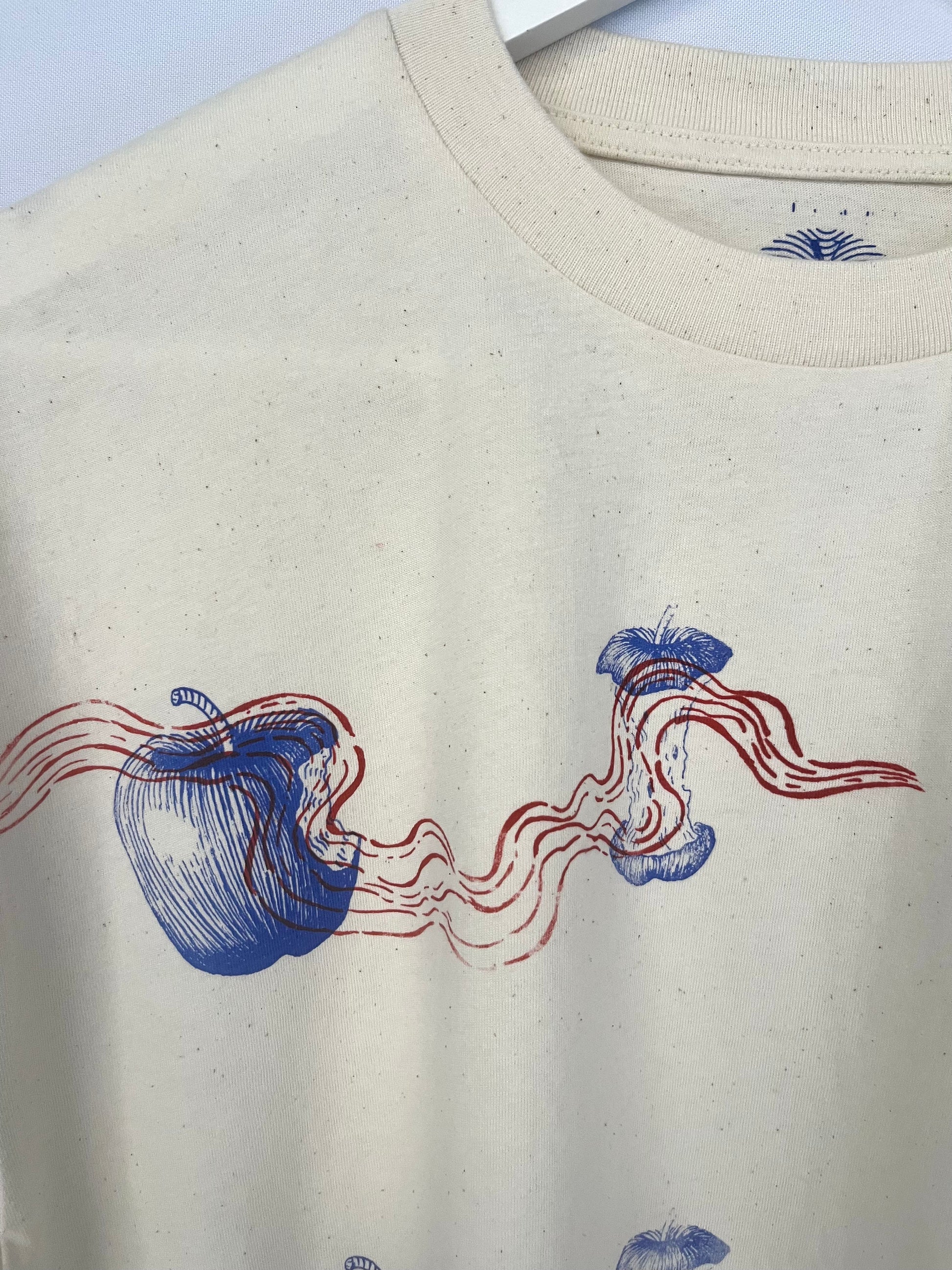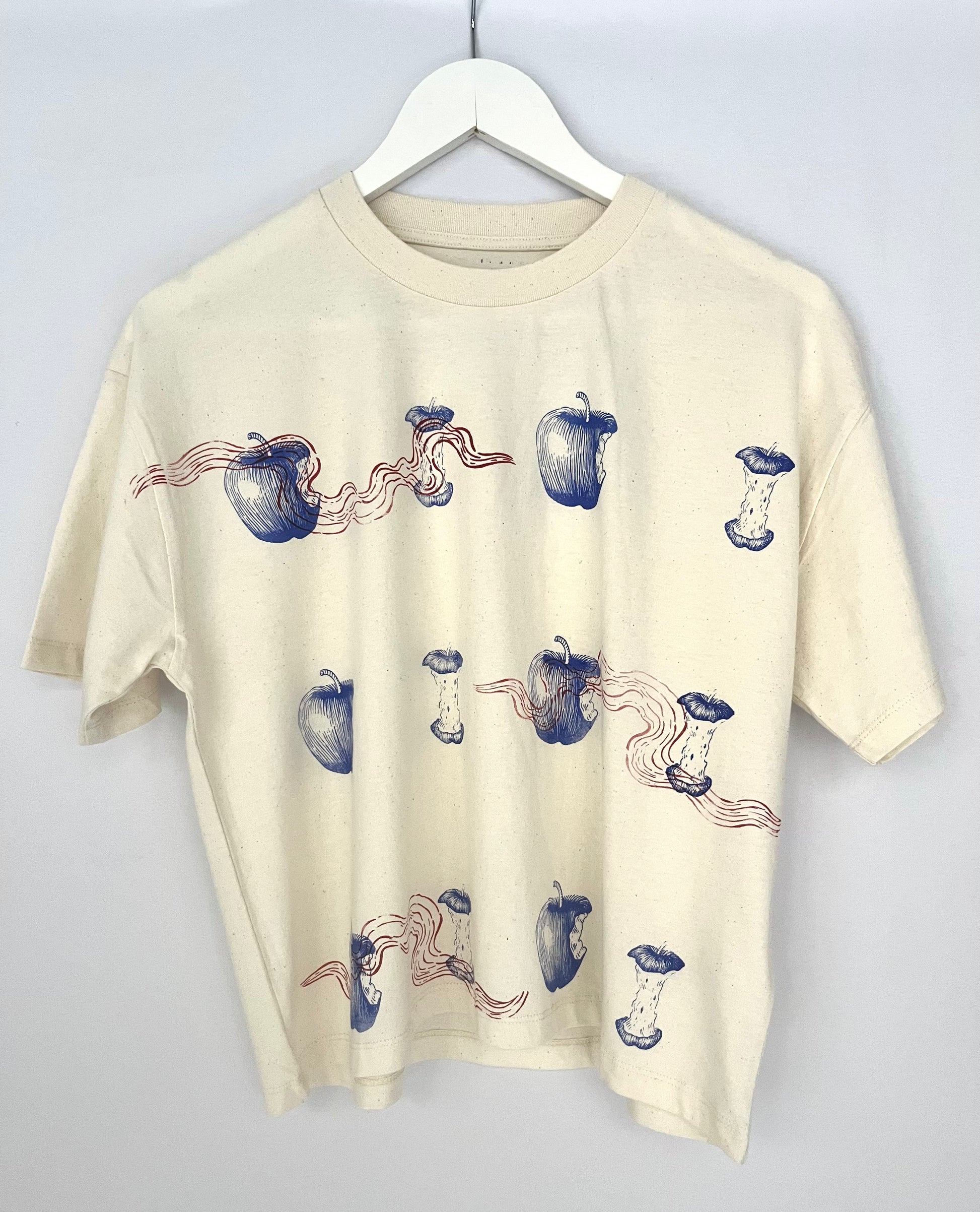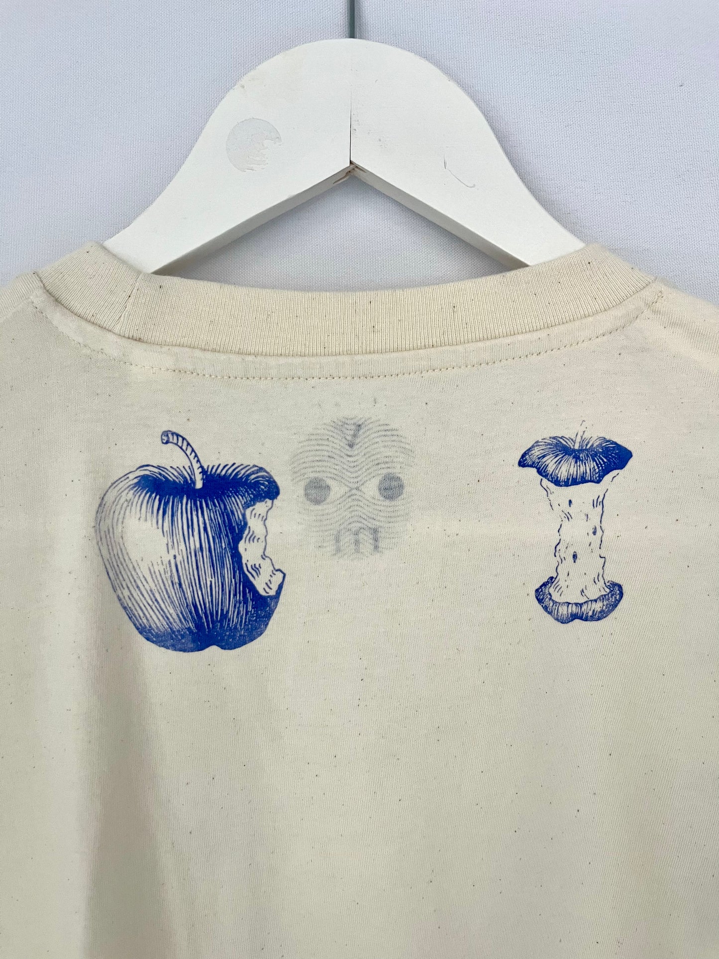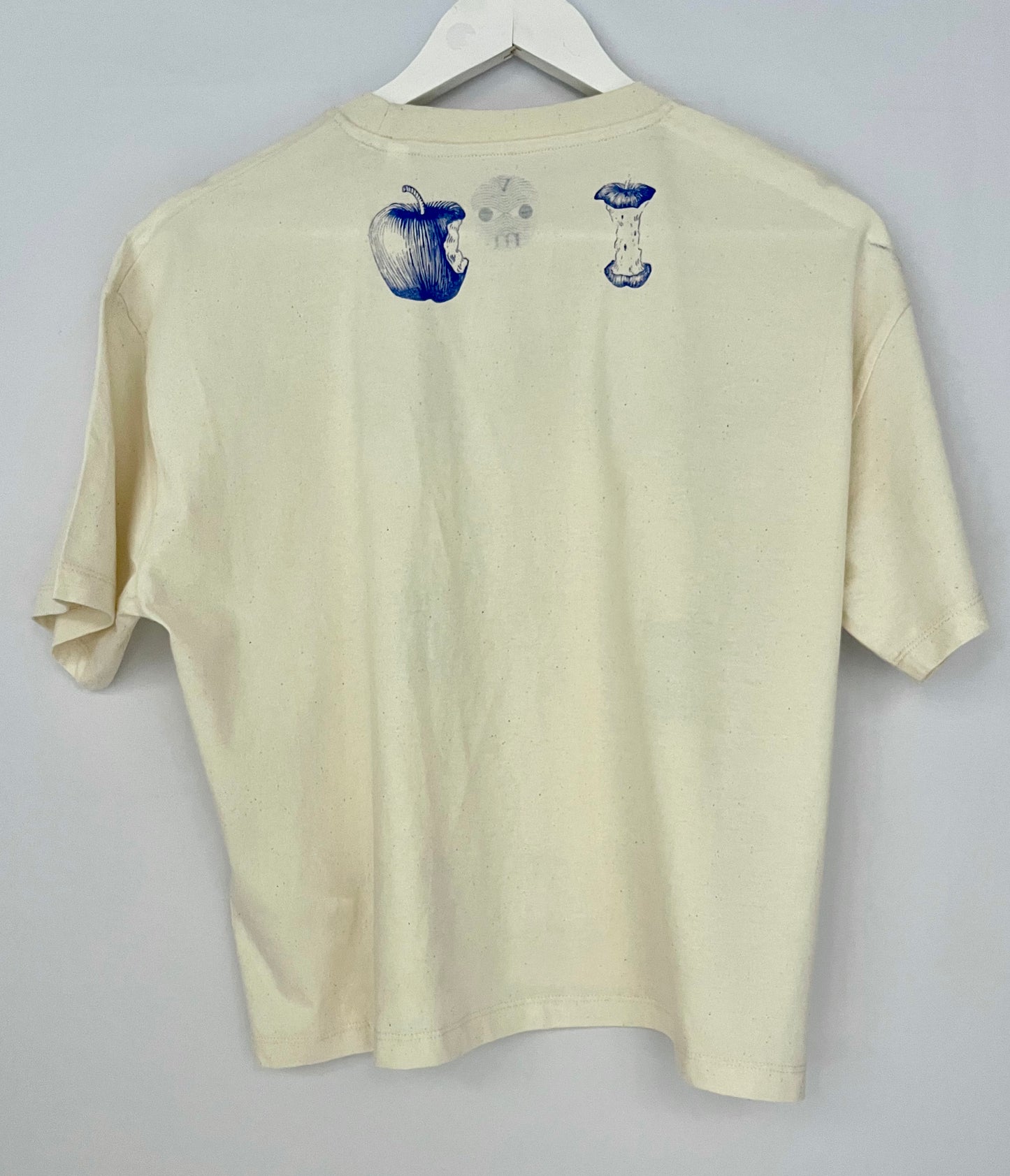 Tshirt Stanley Stella color bianco raw grezzo, modello boxy in jersey di cotone biologico 100% , 180 gr, con maniche a giro e spalle scese, serigrafata con mele di Biancaneve e di Adamo ed Eva in blu klein e nuvole rosso porpora.