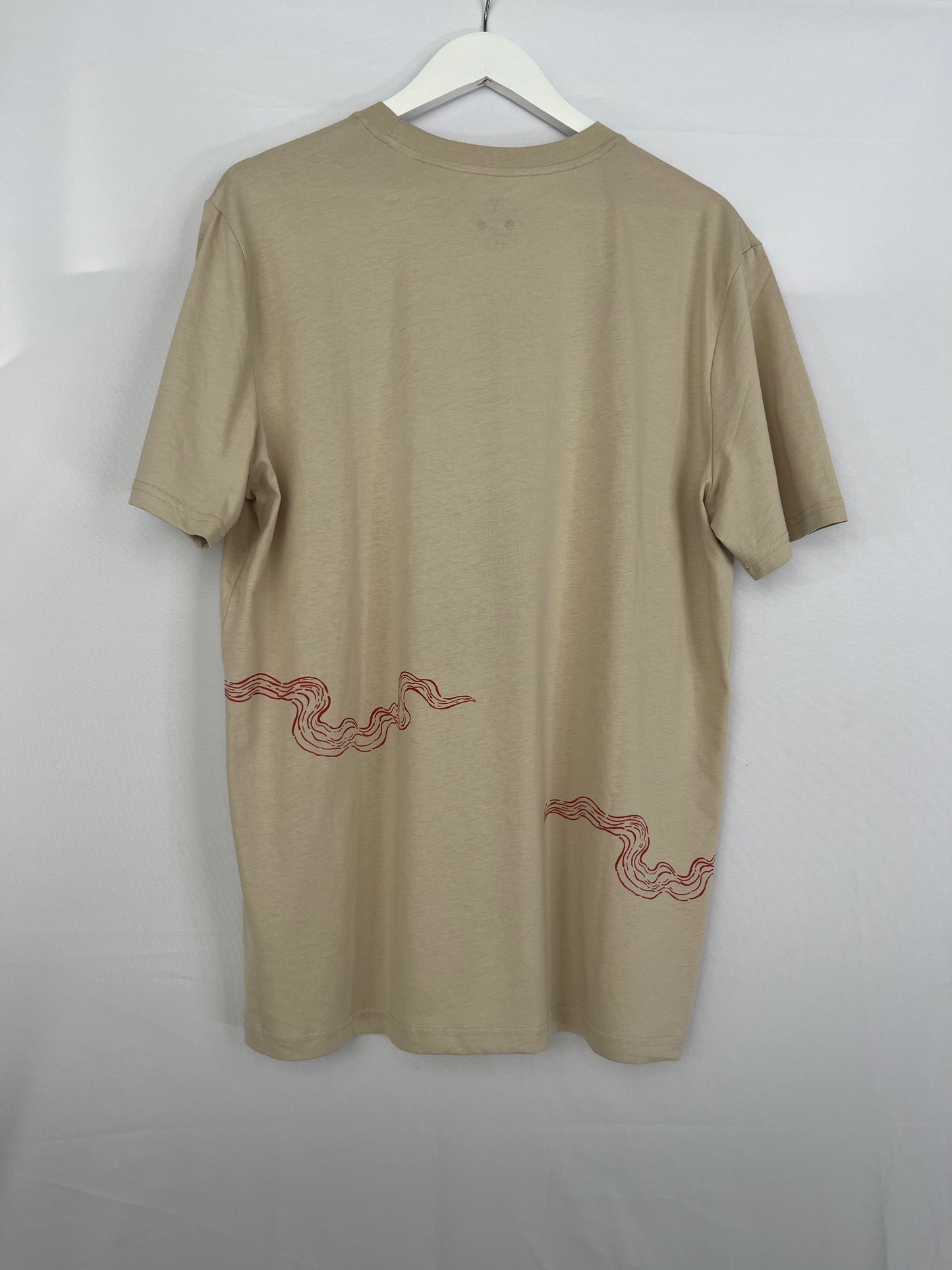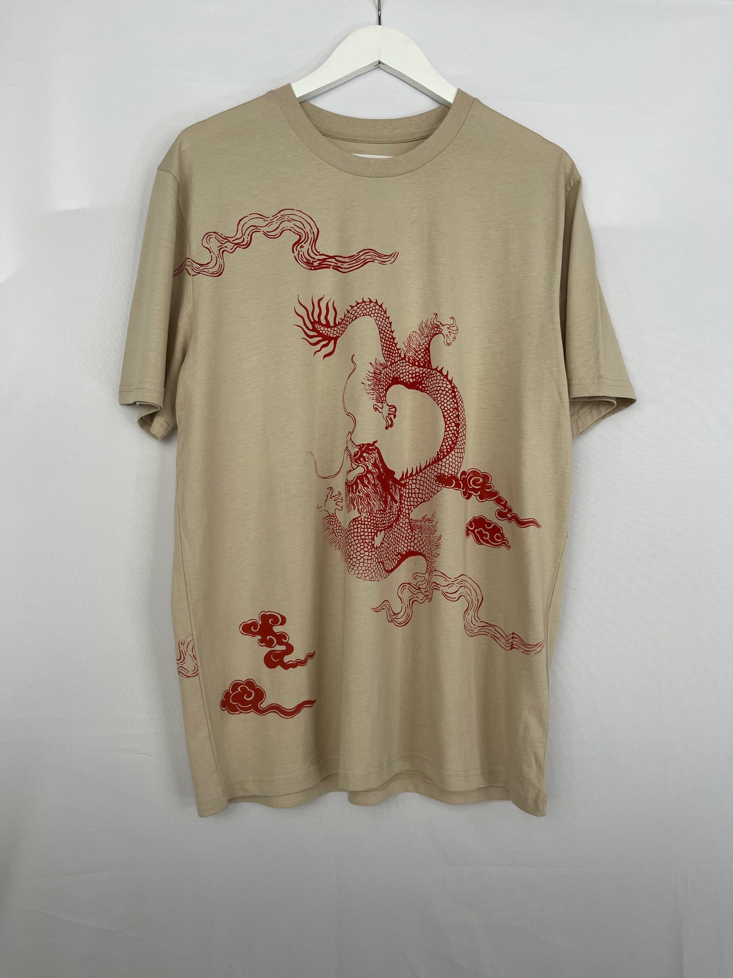 La tshirt color desert dust, taglia large è serigrafata con dragone e nuvole color mattone sul fronte e nuvole sul retro