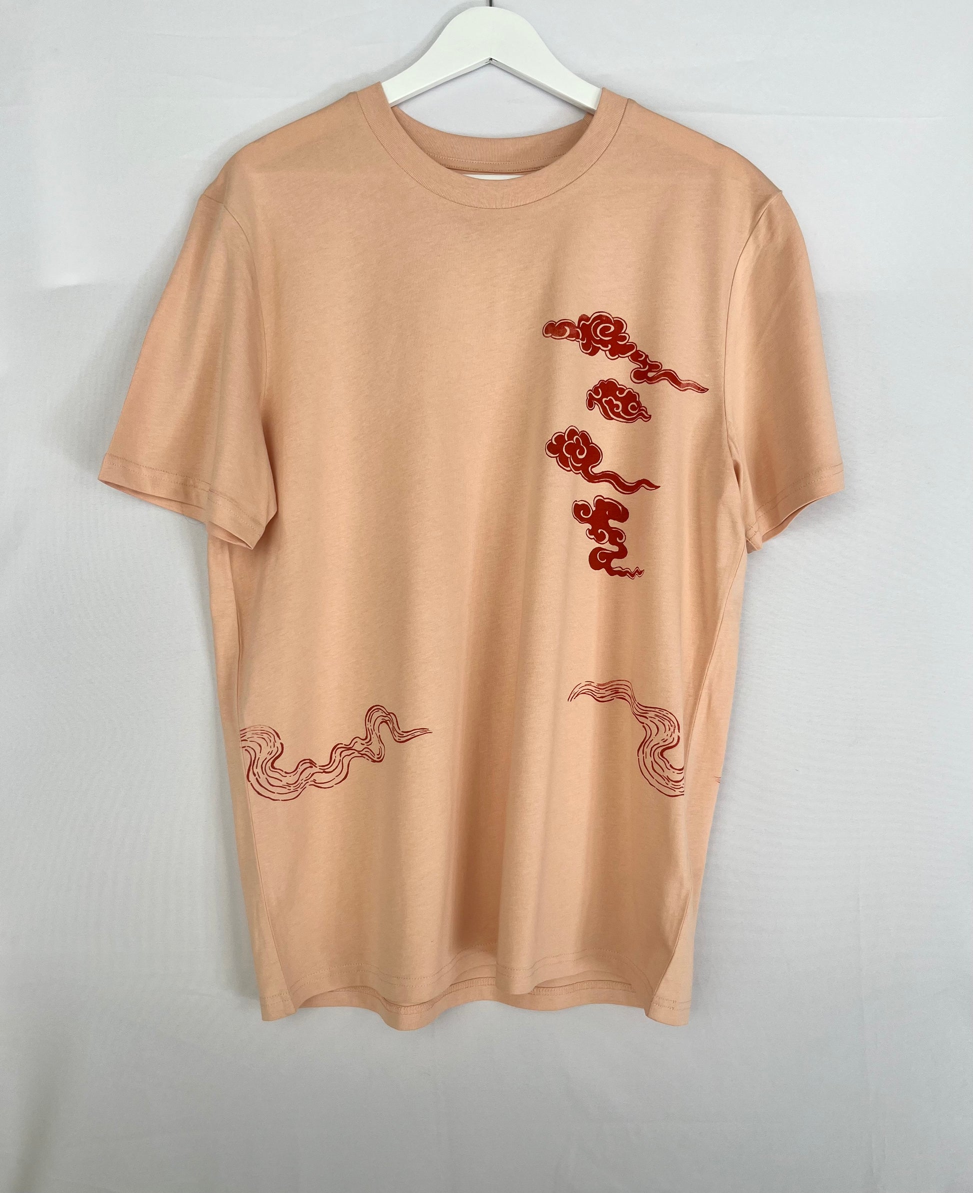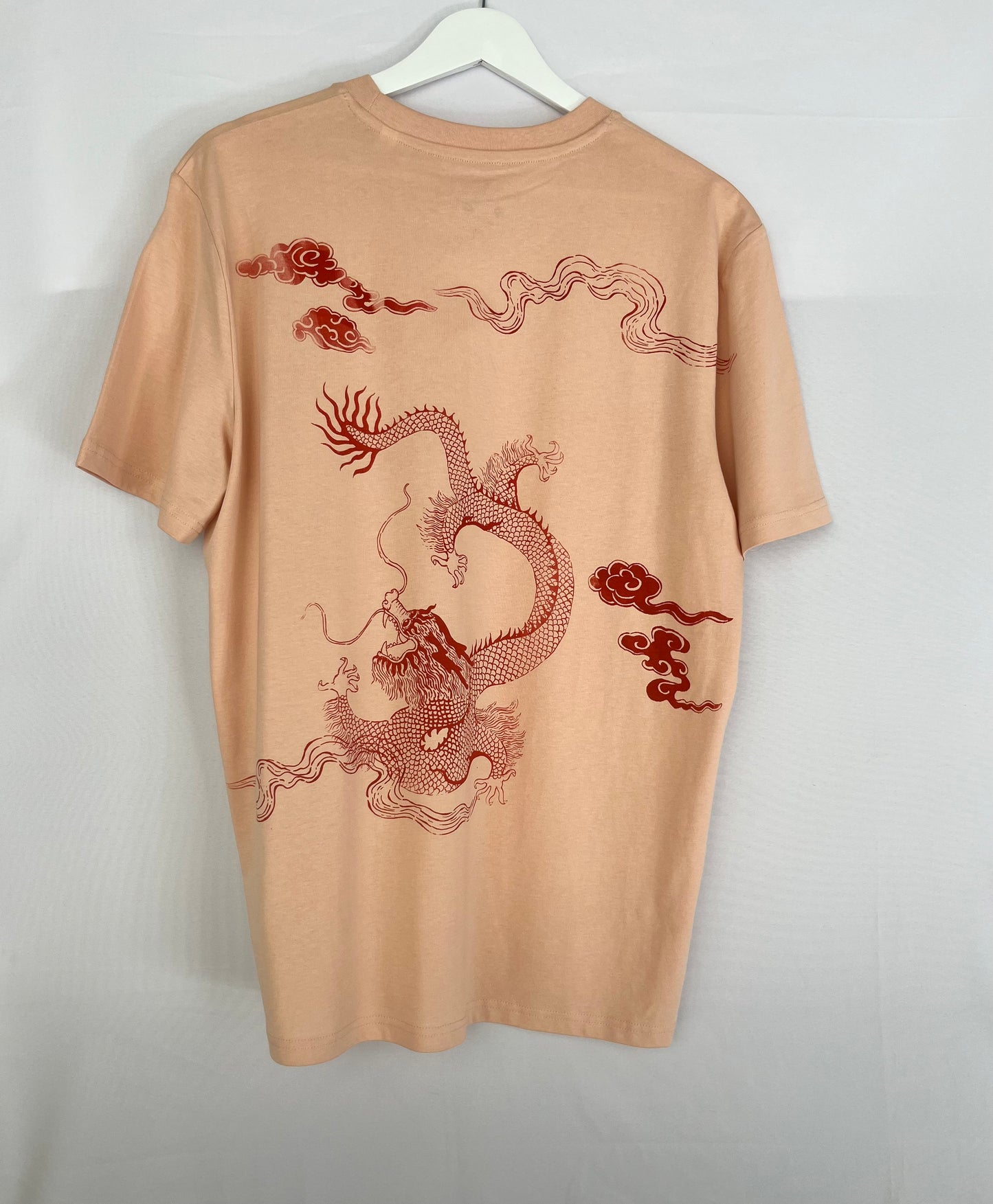 La tshirt color pesca, taglia media è serigrafata con dragone e nuvole color mattone sul retro e nuvole davanti.