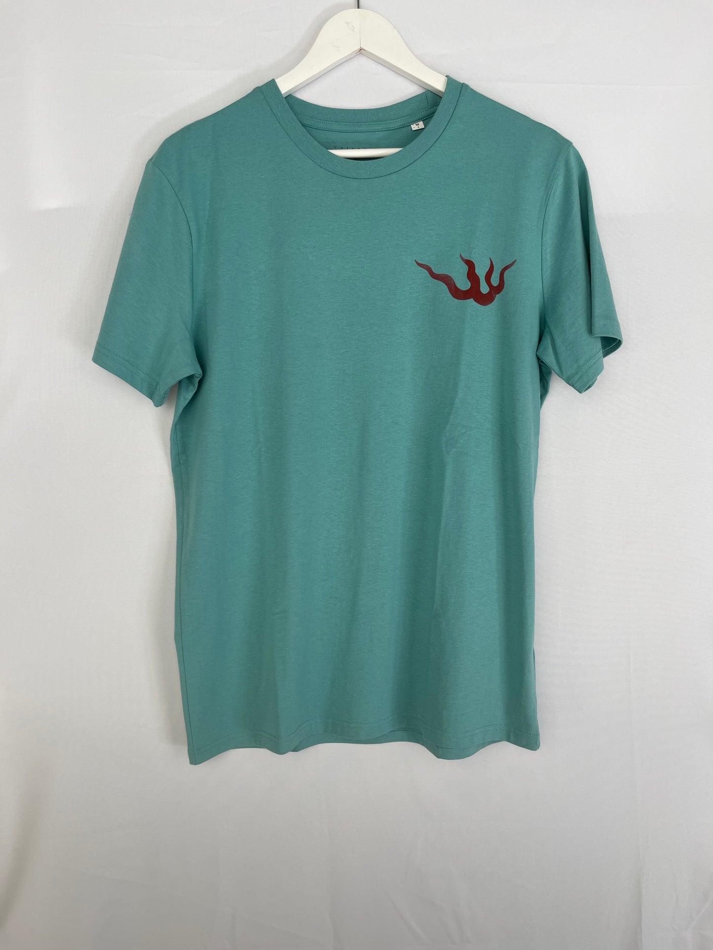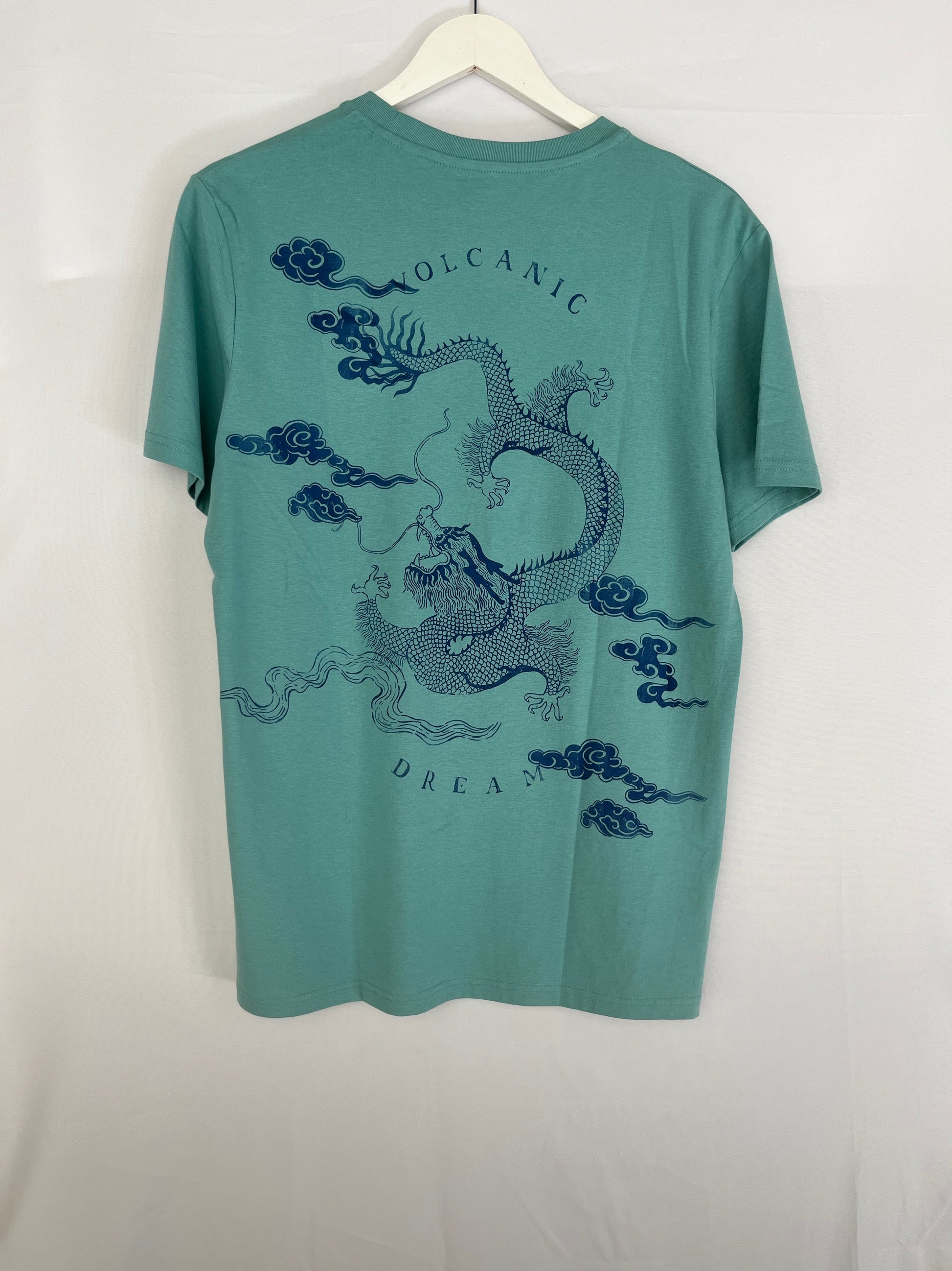 La tshirt color verde taglia media è serigrafata con dragone e nuvole blu navy sul retro e fiamma rossa sul fronte