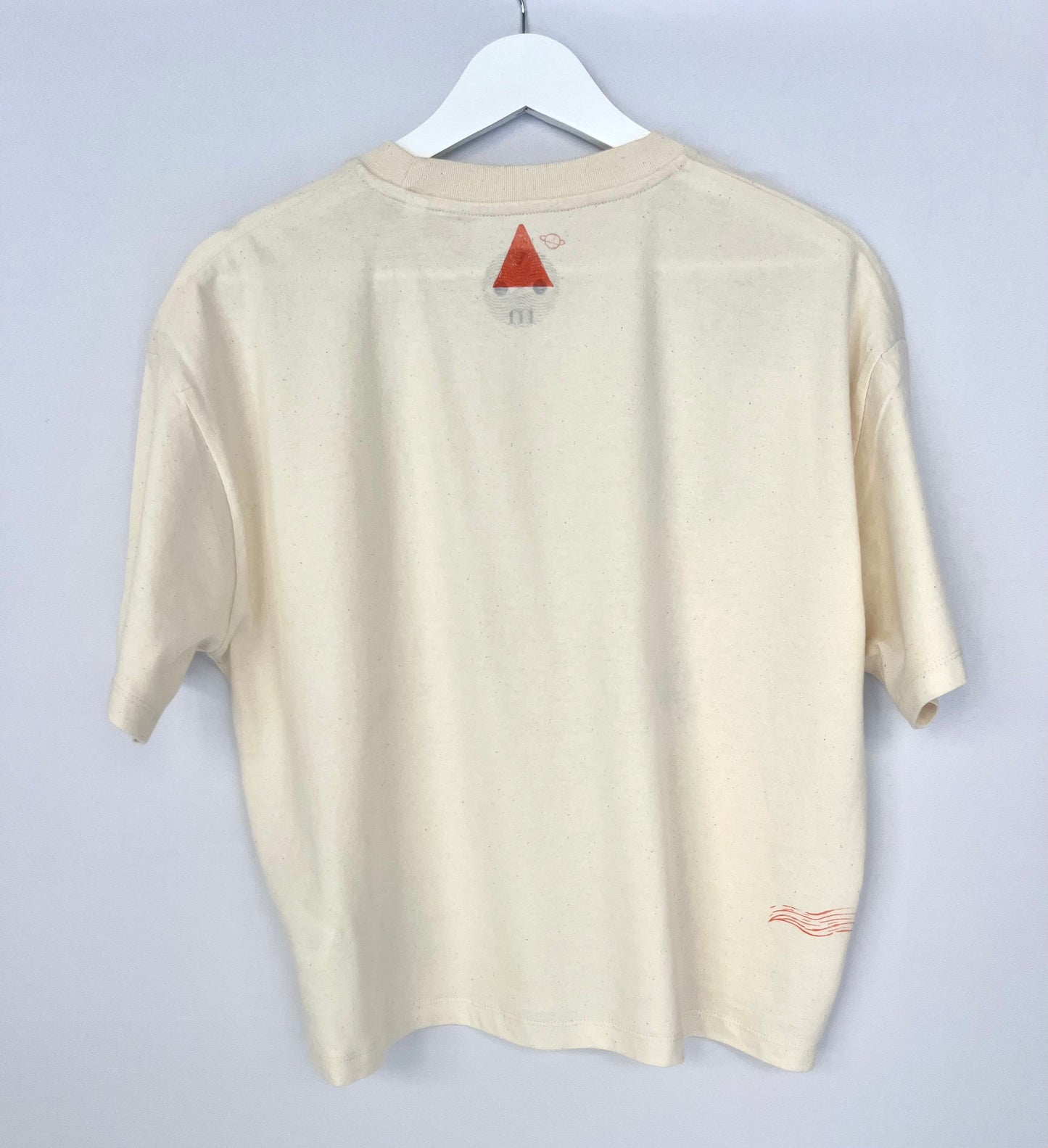 Tshirt Stanley Stella color bianco raw grezzo, modello boxy in jersey di cotone biologico 100% , 180 gr, con maniche a giro e spalle scese, serigrafata con figure marine in blu e arancio